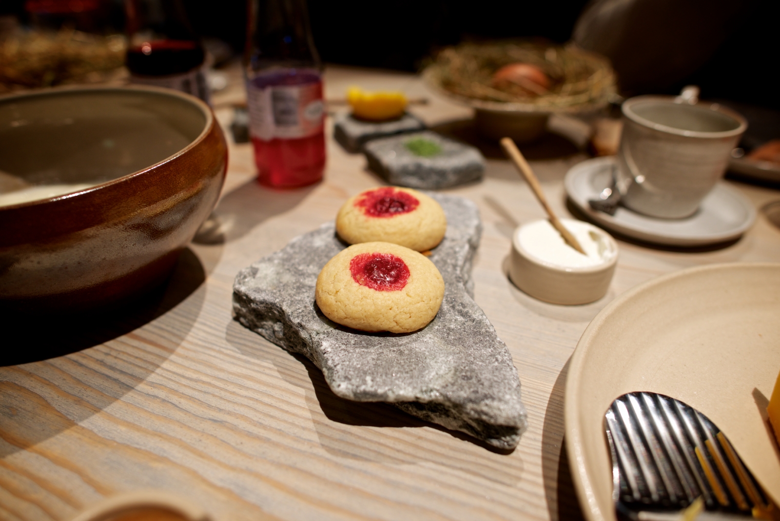 Course 14: Sour milk sorbet, raspberry jam and whisked duck eggs. The Fäviken estate used to house a dairy school for young women, and one of the things left behind was an old hand-cranked Husqvarna ice cream machine dating back to 1920. It is this same old machine that is brought into the dining room and used to make a sour milk sorbet before our very eyes. The fresh, slightly tart milky sorbet was then cocooned in vast soft folds of duck eggs whisked with golden syrup, while a little puddle of raspberry jam lay hidden underneath just waiting to be discovered. Can there be anything more comforting for dessert than milk and berries? This was a taste of summer meadows rekindled in the middle of a frosty November evening.