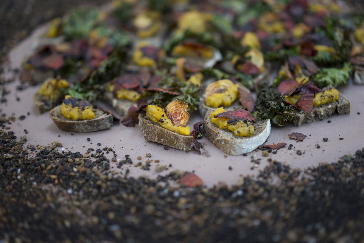 Since this all took place during autumn, Masayo’s meal was a celebration of the season. Not only in the chosen produce, which consisted of green kale, danish rye bread, a roasted pumkin spread and a variety of coloured beet chips, but also in the composition. The brown rye bread represents the soil, where all things grow from. The green kale is the green grass, covering the earth, and the beet chips the leaves. So it all looked and felt like a forest ground in autumn – an edible depiction (of sorts) of the season that surrounded us at Vejle.