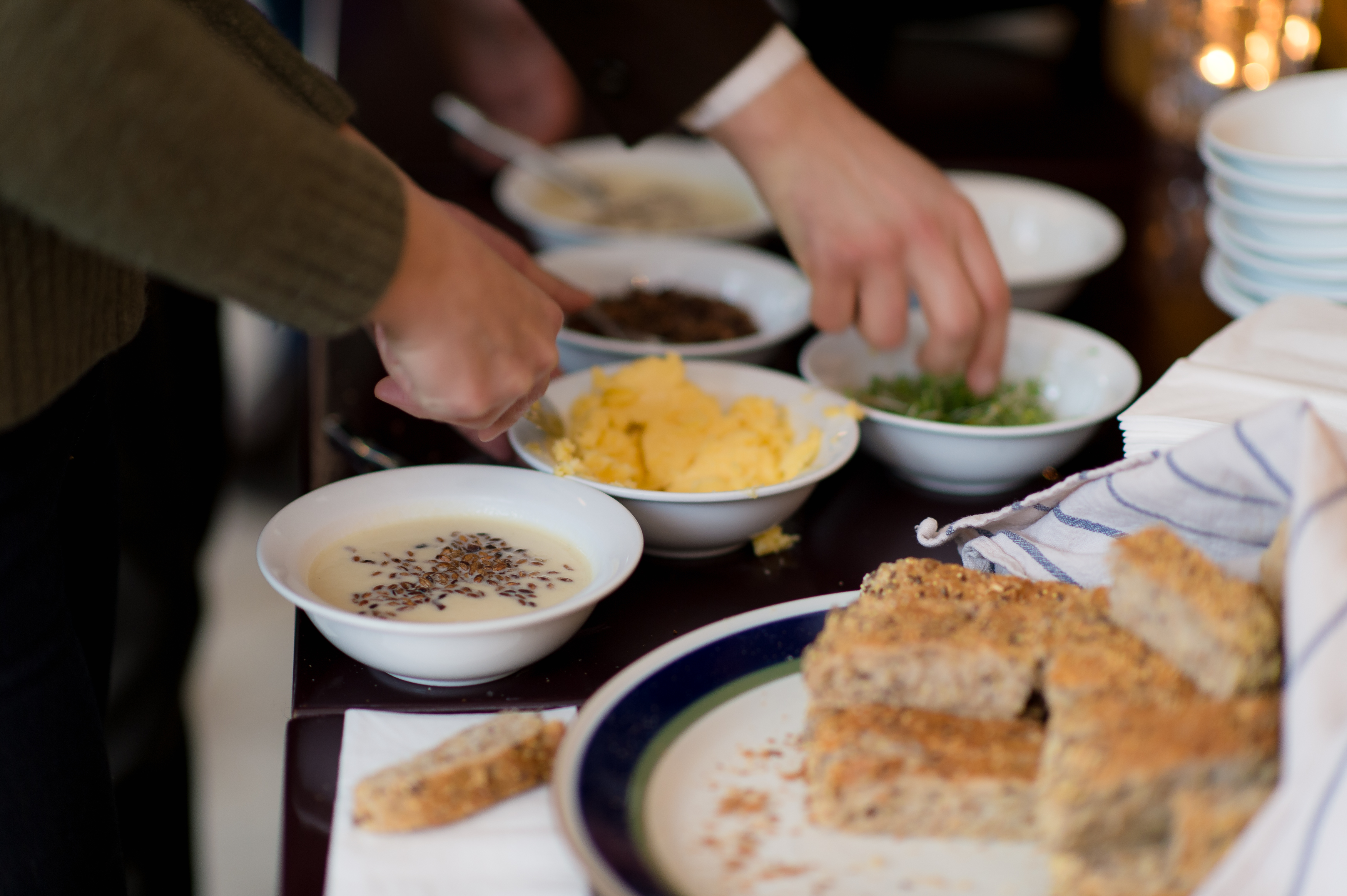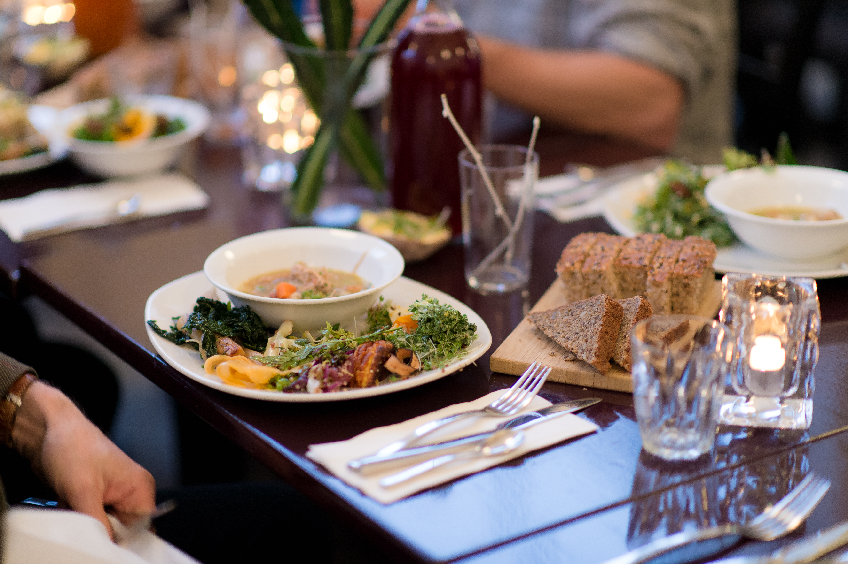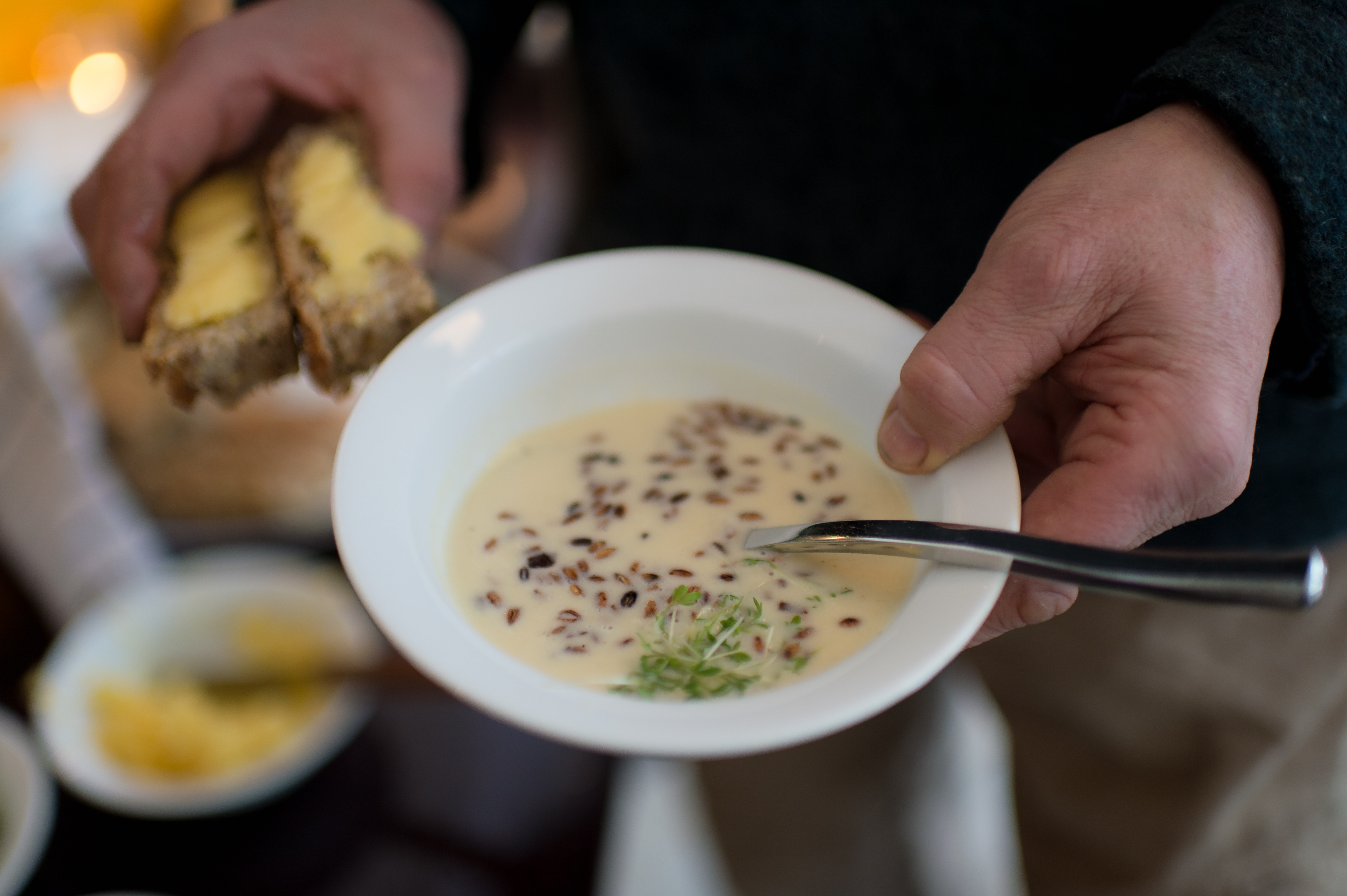 – Welcome! Please have a seat, says Ole Torsvik, head chef at the restaurant by Kunstnernes Hus in Oslo. Two weeks have gone since our visit to Fokhol farm. Now, the farmers have been invited to the city as guests, and are enjoying a delicious celeriac soup.