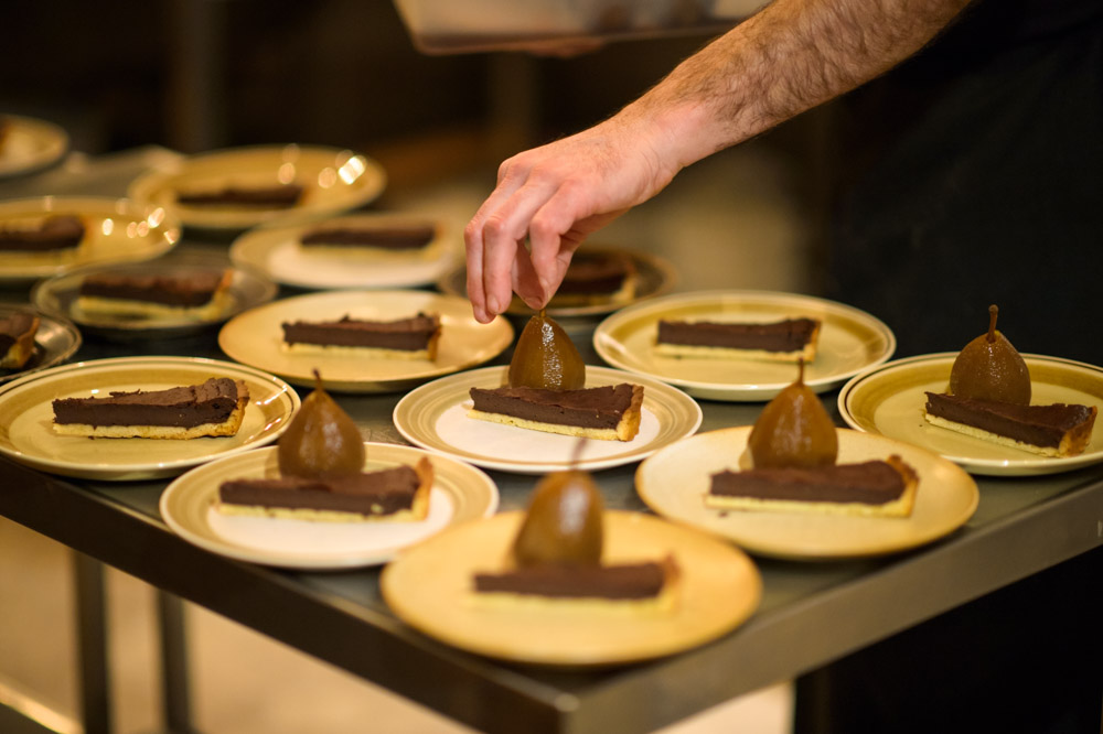 Pears stored in beer syrup with chocolate pie cooked in chocolate syrup – Bøgedal Beniono