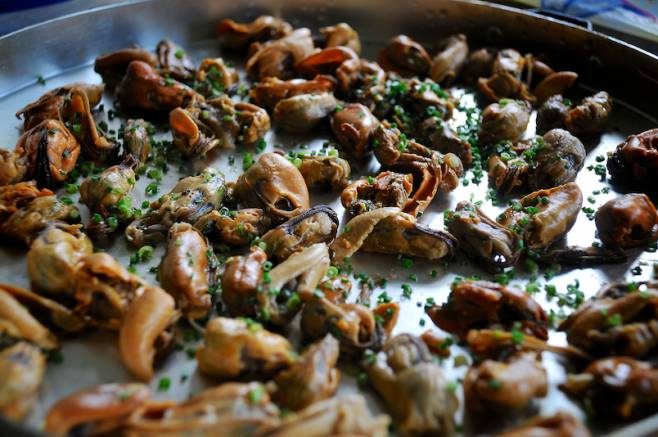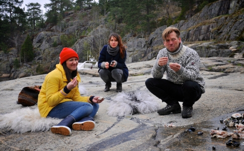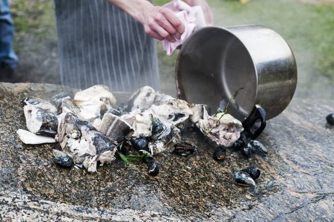 We were soon served our first meal, a so-called fiskemølje, a traditional Norwegian dish of catch of the day boiled in seawater, vinegar, bay leaves, salt and pepper. The big surprise of this dish was that it was poured directly onto the coastal rocks for us to eat from, making it a sort of smörgåsbord of the freshest cod, flounder and mussels I had ever tasted. Struck by curiosity, we approached as Kjartan explained that the mussels used were picked just ten metres from where we were standing only twenty minutes ago. As we started eagerly tucking into this rustic feast from the sea, one could hear the pleasant hum of satisfaction and laughter building.
