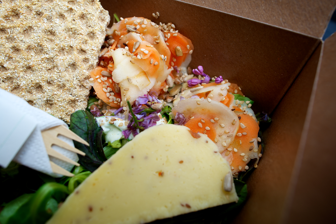 For lunch, guests enjoyed a light salad of wild herbs, shoots, and flowers together with lightly pickled carrots and parsnip, crispbread, as well as a piece of Swiss-style cheese with carrot from Norway’s Den Blinde Ku (The Blind Cow) dairy. This was accompanied by a delicate camomile drink gently sweetened with honey.