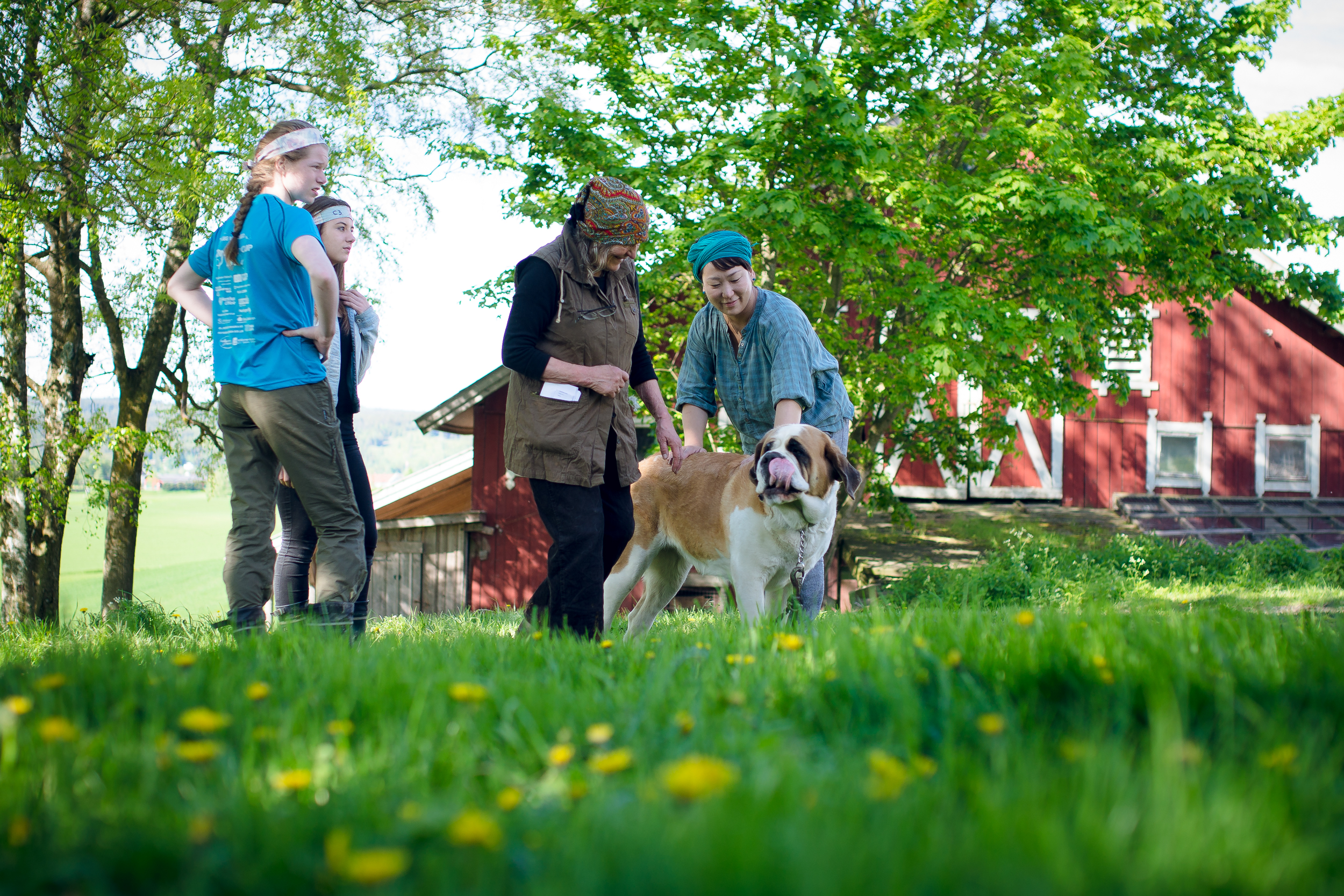 Her animals never stop amusing her. A huge Saint Bernard is lazing around looking like a cuddly teddybear. But if you get too close, she’ll jump on you, having no idea how heavy she is. Sidsel is working on the dogs manners, but right now she is busy attending to the bunch of teenagers who’s just arrived at the farm. They come from the nearby Nannestad Secondary School, and are working at the farm all week. The weather is fantastic. All shorts and rolled up sleeves.