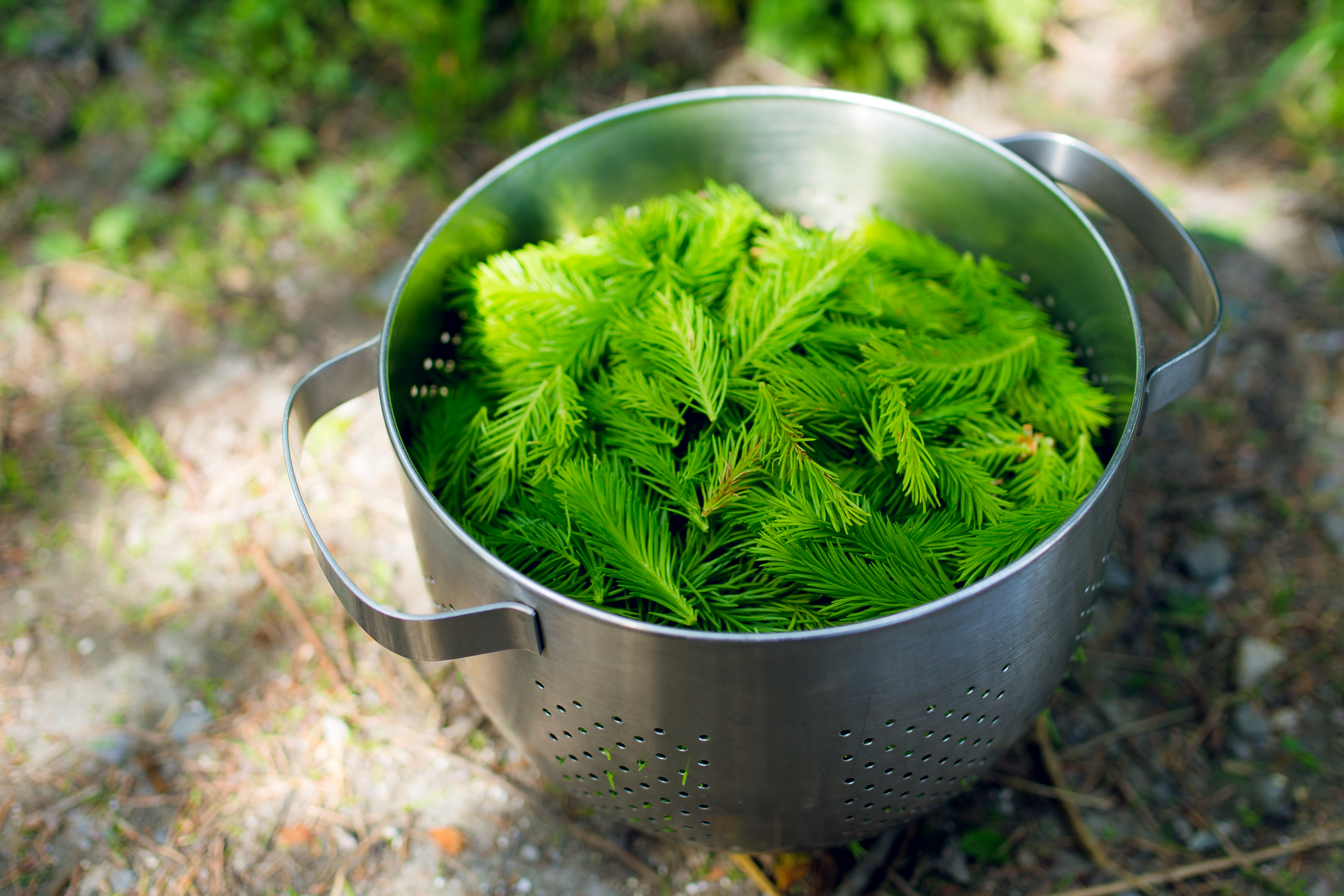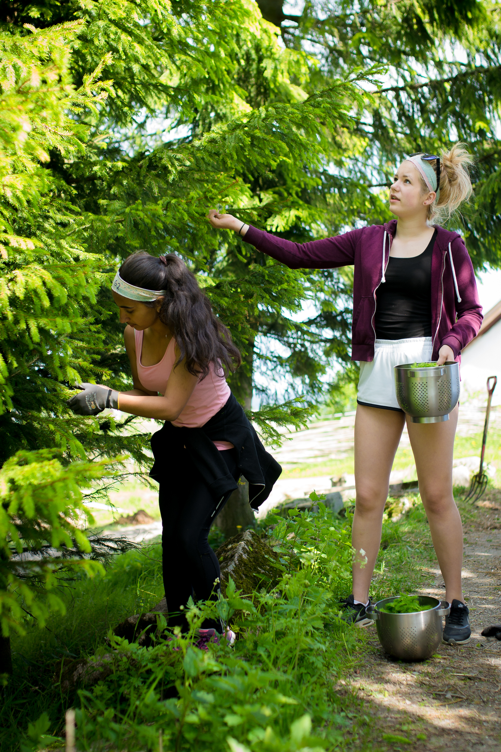 Arndis and Ranya are helping Cecilie picking nettles for a purè chef Masayo is going to use.