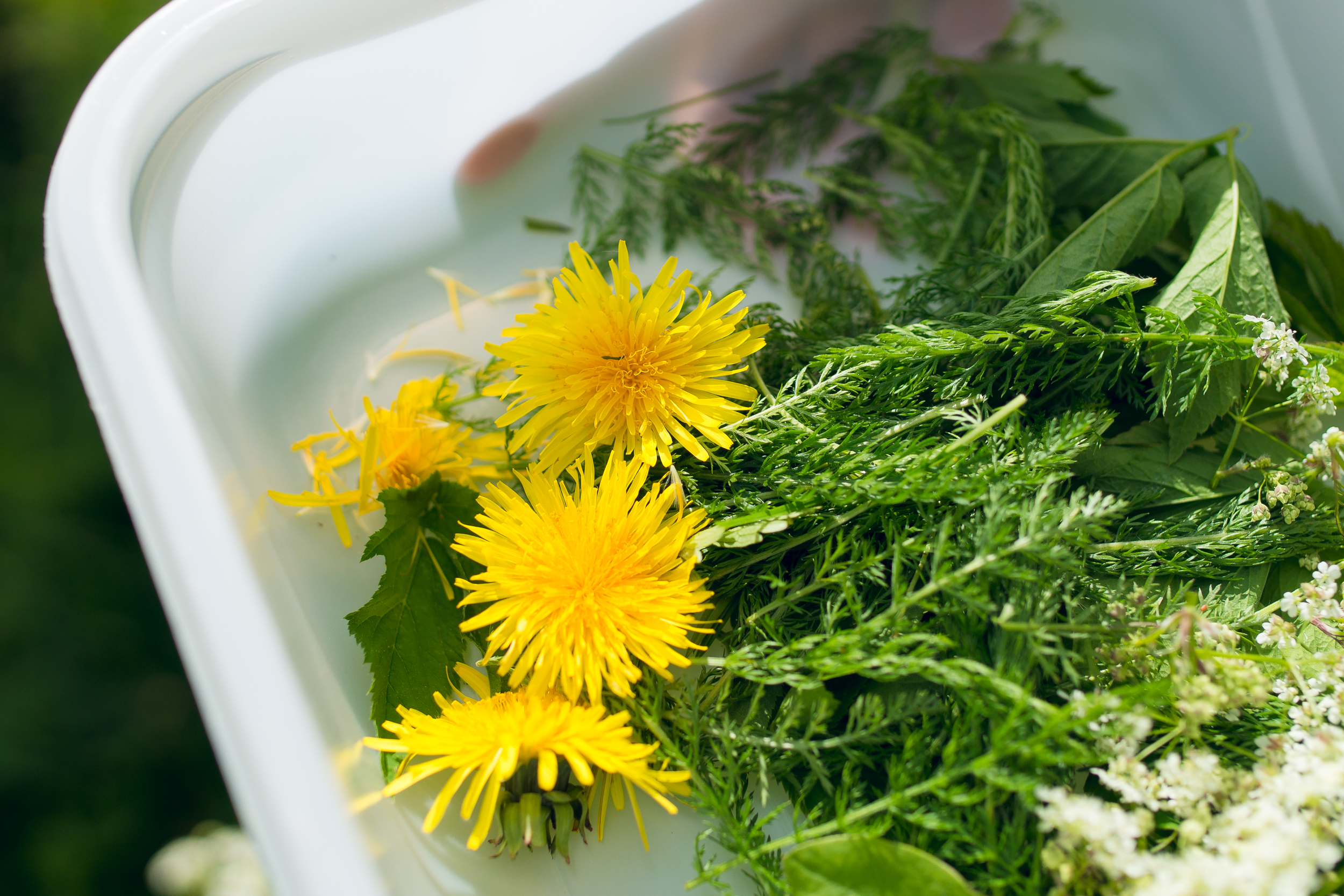 She picks a dandelion, breaks open the hollow stem and rubs it on the sting.