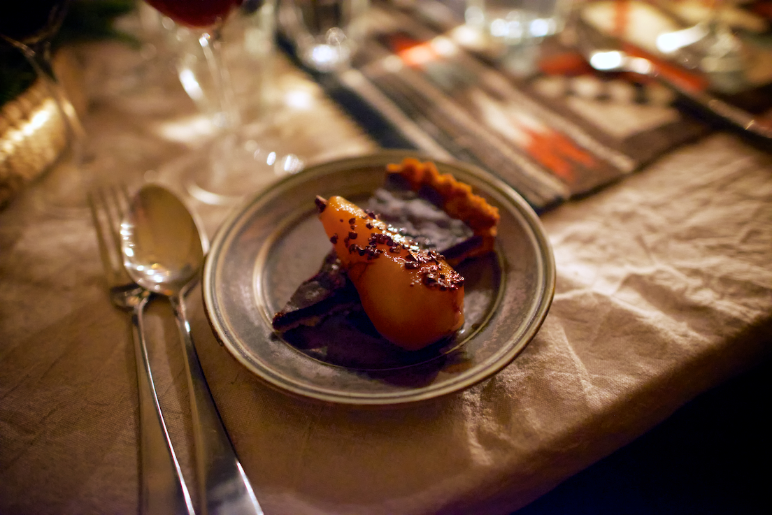 Course 5: Chocolate Tart with Beer Poached Pears. For the final course, a crowd-pleasing chocolate tart served with beer-poached pears and cocoa nibs made from criollo beans. This dish had a great contrast in texture – tender spiced pears, crunchy cocoa nibs and smooth silky dark chocolate ganache.