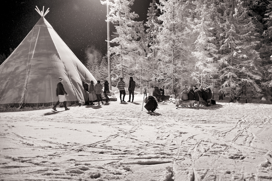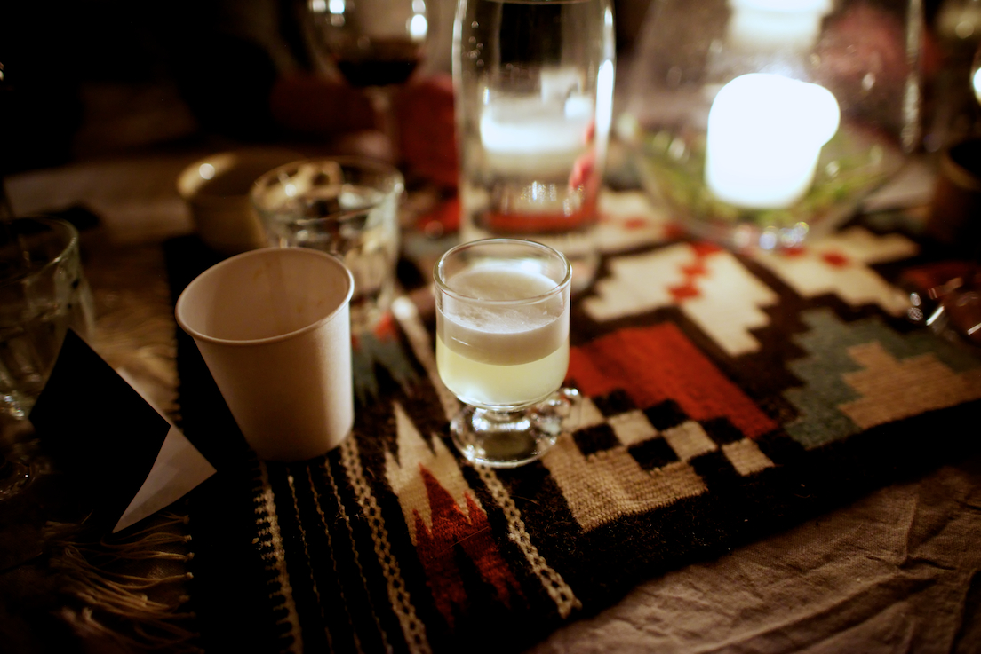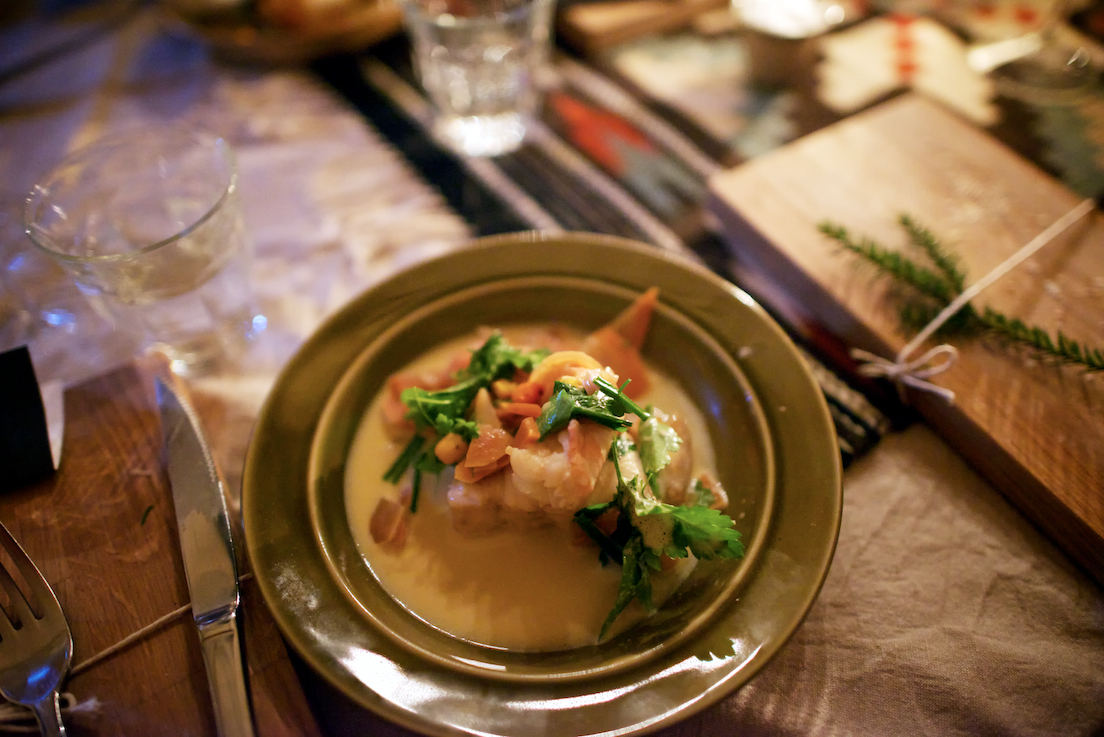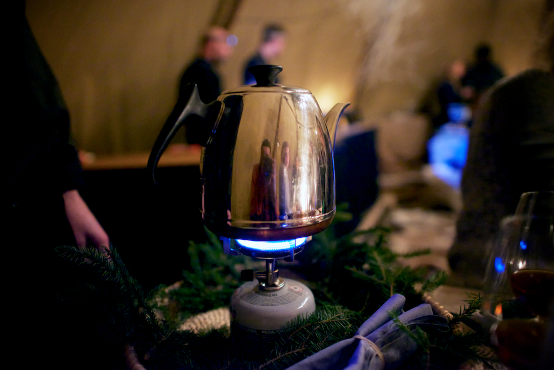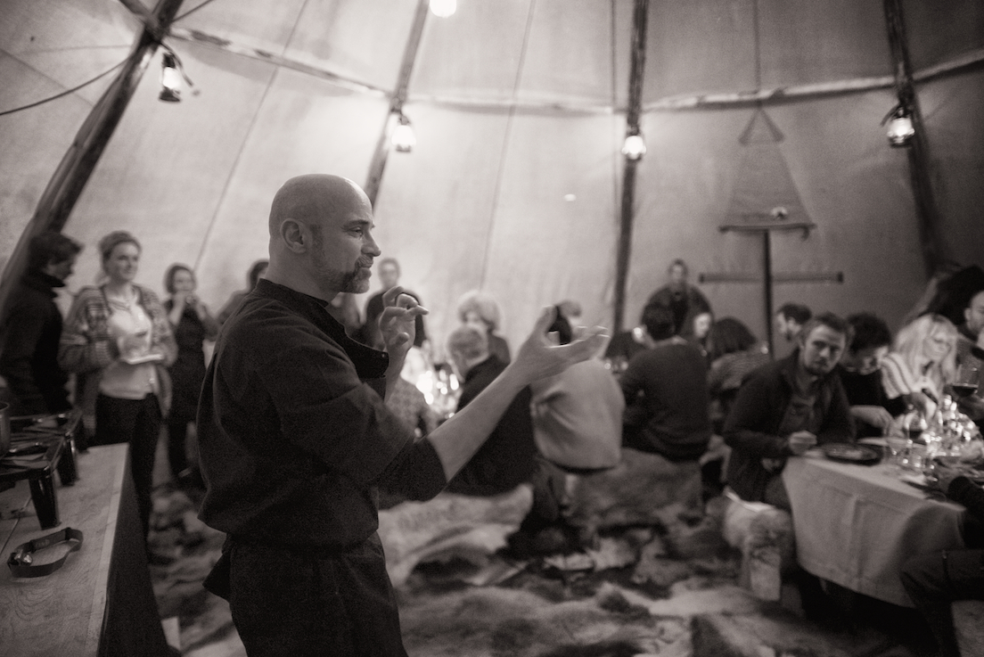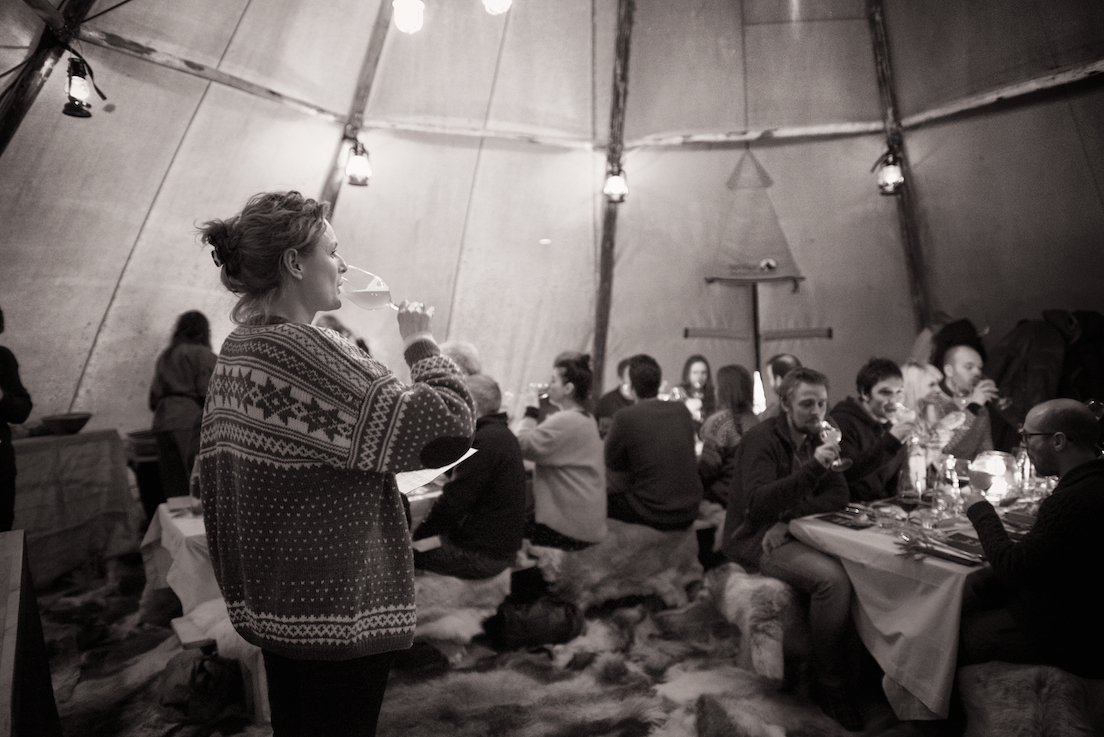 The guests were then led inside to the toasty warm lavvu that had been put up under the watchful eye of Food Studio’s scenographer Caroline Magnus, where thick traditional woollen lusekofte jumpers were handed out and the warm orange glow from the hanging oil lamps revealed tables that had been laid out with a simple Scandinavian elegance. In traditional Sami style the entire floor was covered with reindeer pelts, while a makeshift kitchen was set up at the far end of the tent, where Thomas and Magne were busy working away. Once seated, the evening’s culinary adventure would begin in earnest.