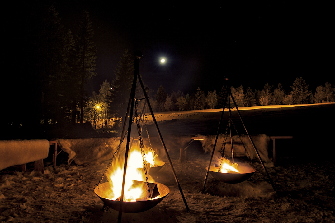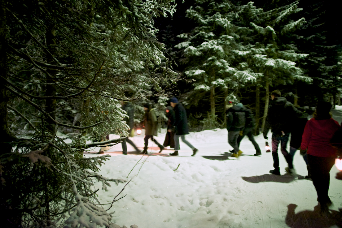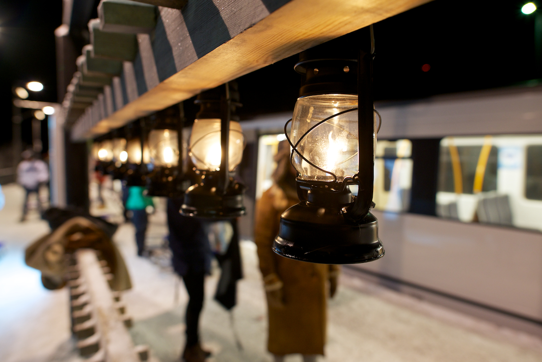 As the train pulled in to Voksenkollen station the mystery appeared to deepen. The guests picked up one of the burning oil lamps awaiting their arrival, and began the next part of their journey on foot. We had been warned to bring clothing suitable for walking in the snow, and sure enough we soon began an exciting journey through the ice-filled forest, the anticipation building with each step.
