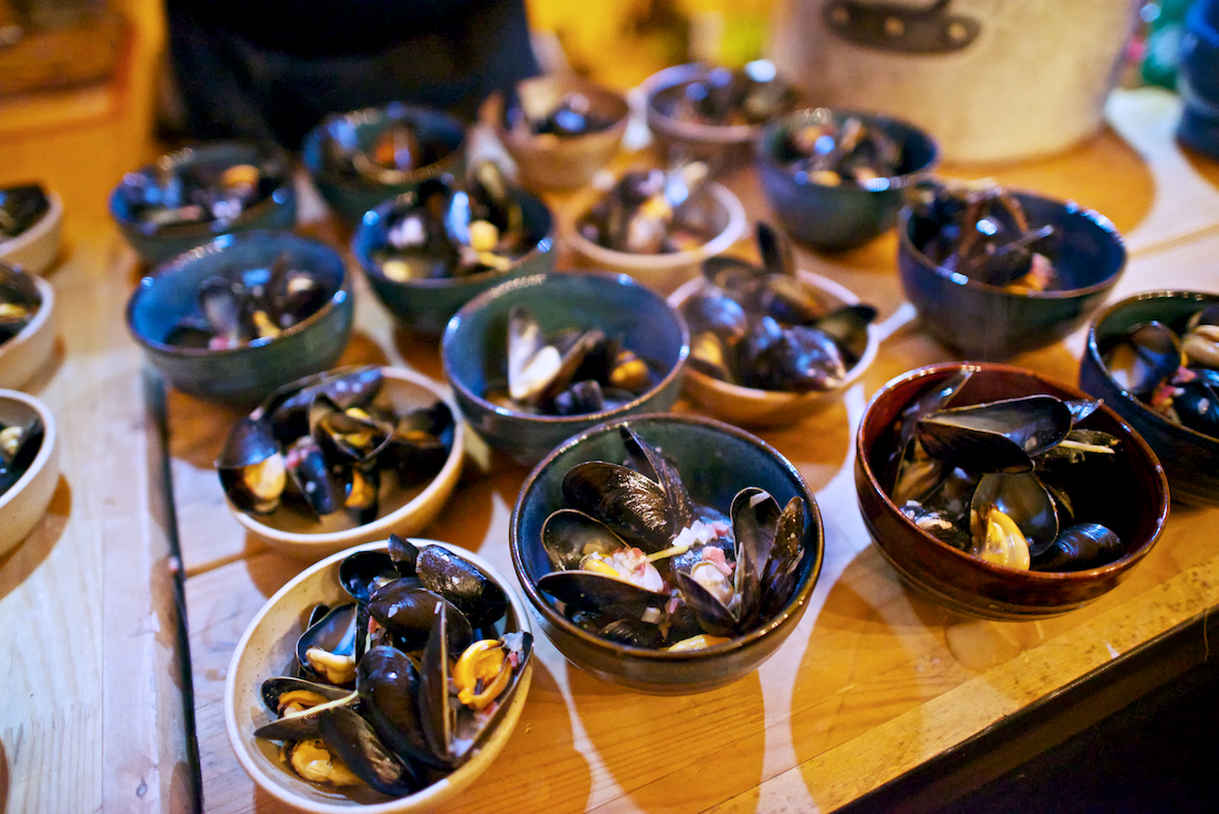 Course 3: Mussels with Almond milk, Beer and Air Dried Pork. Mussels from Frøya were steamed in almond milk and pale ale and served with cubes of salty air-dried pork. This dish was also paired with Bøgedal’s No.320, whose soft sweetness balanced the saltiness of the pork nicely.