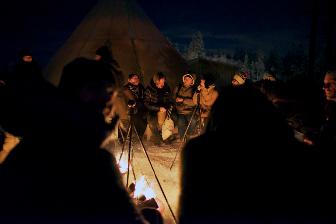 Cold, brittle air filled our lungs as we walked past pine trees shimmering with frosty snow, and beautifully evocative ice lanterns had been planted along the way to mark our path. The thick layer of snow eerily soaked up all sounds, softening the buzz of conversation and the crisp crunch of our footsteps. A short traverse across a frozen lake revealed a virtually cloudless and moon-filled sky overhead, before we plunged back into the dense forest for the last leg of our journey. Eventually, a large traditional Sami lavvu tent some twenty metres wide loomed in the distance, with burning logs of birch glowing outside to welcome our arrival. This would be our base for the night.