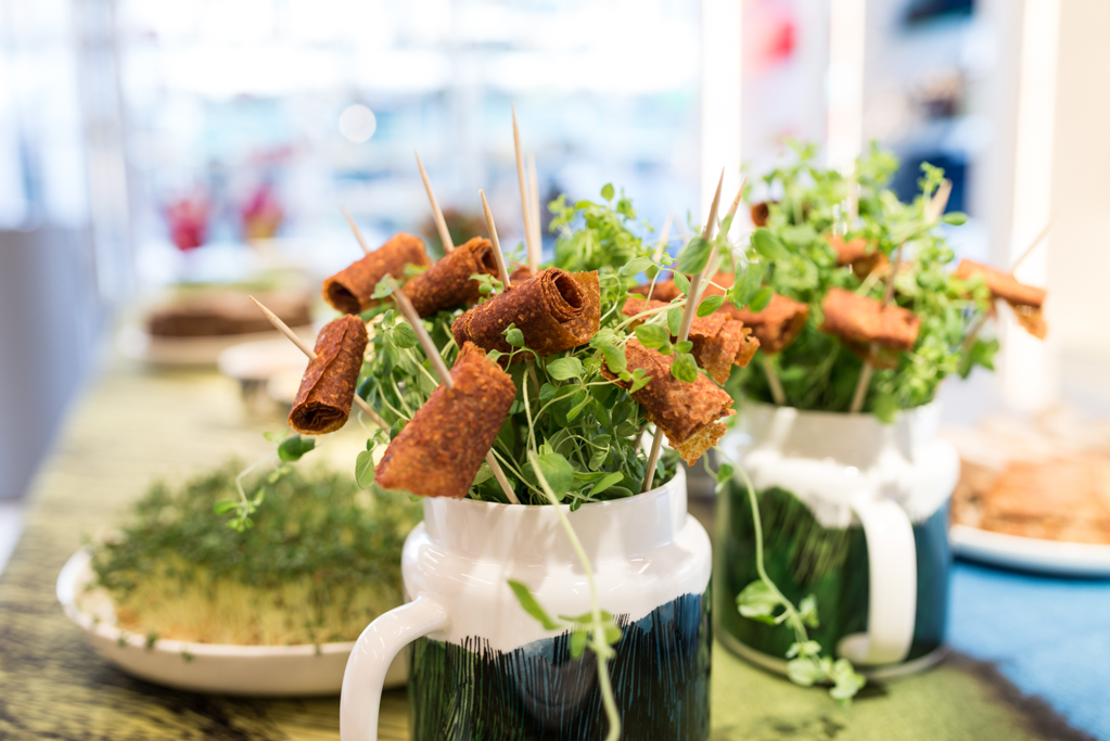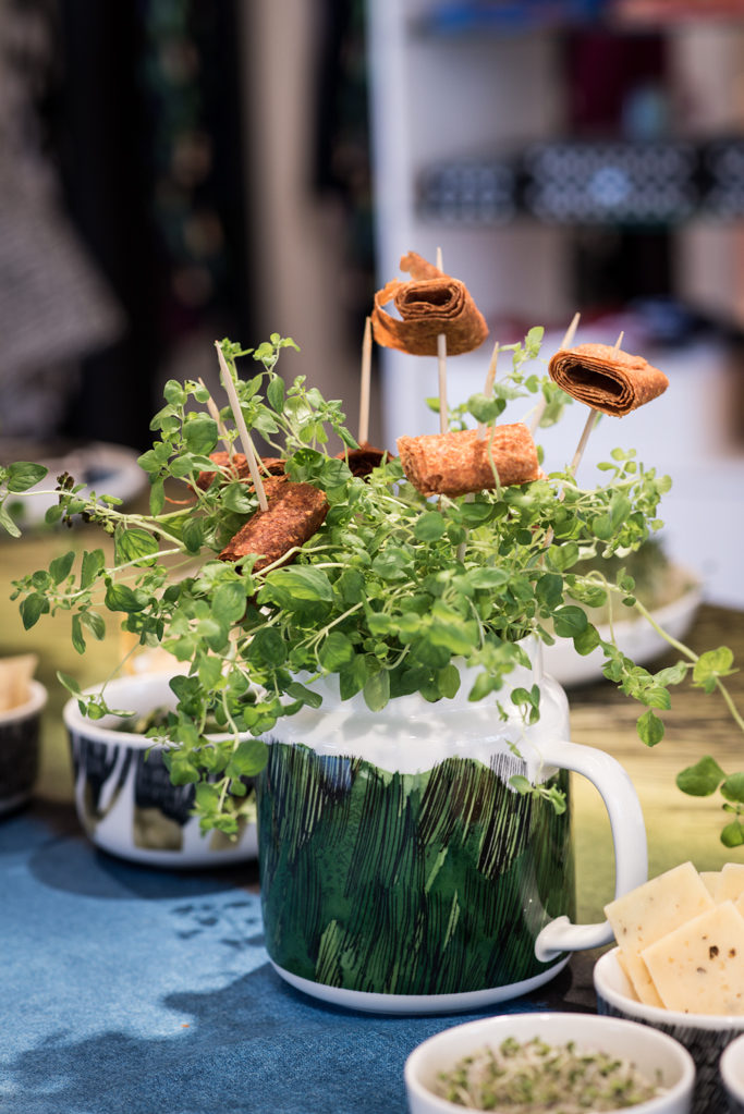 A touch of sweetness was provided by some apple and cinnamon ‘leather’ rolls, neatly arranged on sticks in Marimekko Weather Diary jugs. In addition, coffee from a single smallholder farmer in Yirgacheffe, Ethiopia, was served – full of flavours of jasmine, bergamot, peach and citrus.