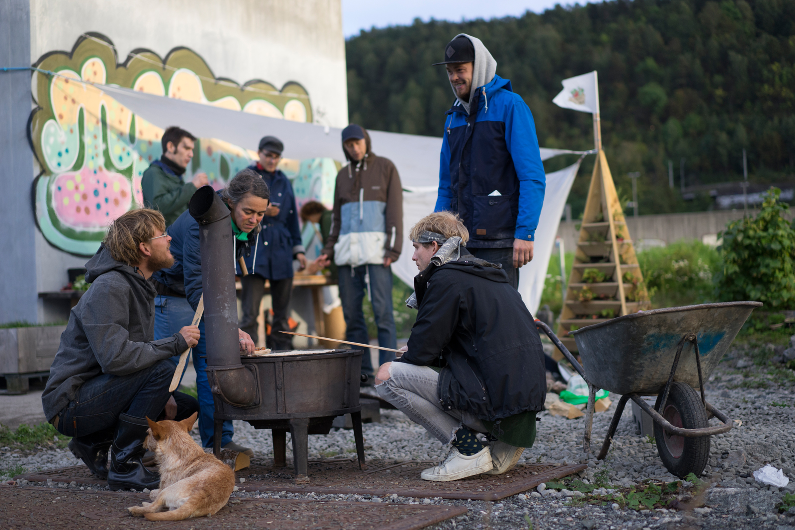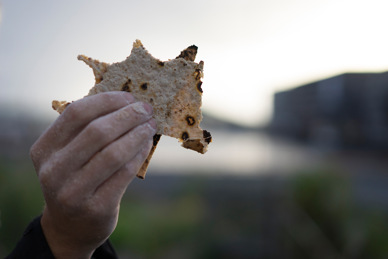 Gazing towards the Oslo fjord, with the city to our backs, we approach Losætra at Loallmenningen. The smell of smoke from a fire and freshly baked bread meets us at the middle of the road. It is baker Emmanuel Rang, who is already preparing flatbread. A landscape of smells embraces and releases a temporary store of memories, bringing along past travels in time and space. Loallmenningen is hollow. This is where the Flatbread Society Grainfield will be established, on one of the seven commons in Bjørvika. The foundation of this site is a ceiling, and just as water flows under a glacier, the rush traffic of Oslo channels invisibly under our feet through the Bjørvika tunnel. Now the common will be filled with soil and visions.