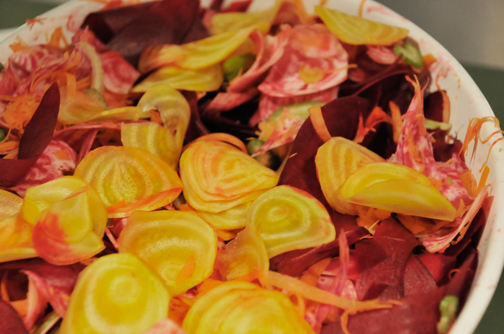 We cut the beets on a mandolin, so we got thin slices in many beautiful colours.