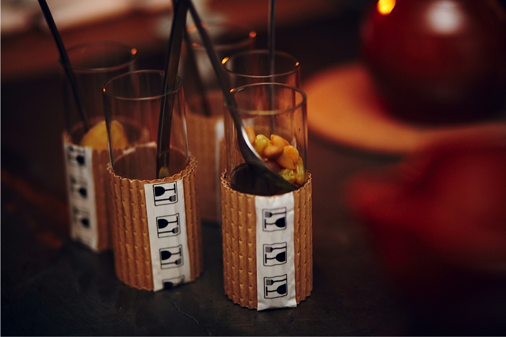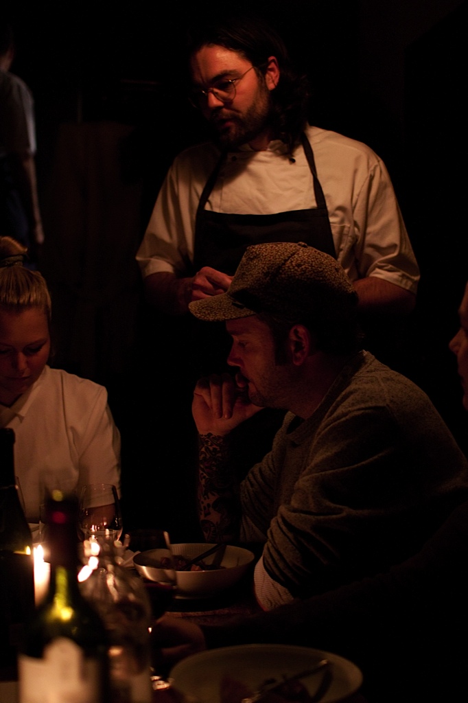 Full of expectations for the evening to come we wandered around Kødbyen, looking for the restaurant. Kødbyen is the industrial, old part of Copenhagen, which some years back became home to many quirky and interesting bars and restaurants. We knew the event wouldn’t be held at one of the regular restaurants, but we didn’t quite know what to look for either. A discrete sign displaying an upside down glass and fork – I’m a Kombo’s logo – gave us a hint that we might just be at the right spot. We walked through the passage where the sign was, and soon after found ourselves outside “the restaurant”. On this cold winter’s day in Copenhagen we knew we would be in for something completely different.