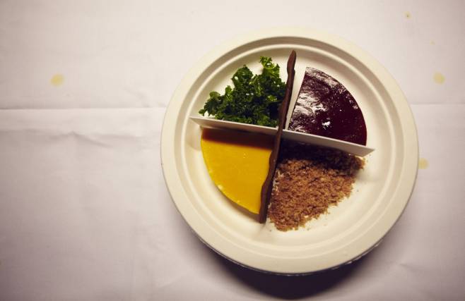 The group was separated in to three small sections on long family style tables. The first dish was already on the table when we arrived. This was a plate with four different sections, separated with straight lined paper. In each section were bright dishes of yellow, red, brown and green, all with seemingly different textures.