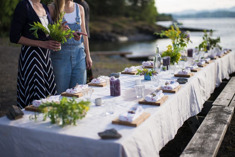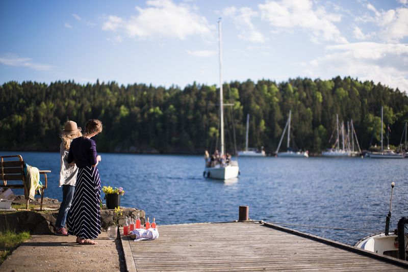 All of the guests met up at the harbour close to Bygdøy, where we greeted them with ice cream – it’s the 17th of Mai after all! After trip with the boat crossing the Oslo fjord in the sun, they arrived at Kjeholmen about an hour and a half later, a small island just outside of Snarøya. We were waiting with freshly made rhubarb juice and bread rolls. Marie Sofie from Blomsterbloggen took the guests on a walk on the island, explaining them when and how to pick flowers – or anything that looks beautiful to you. Everybody made their own flower arrangements that we used to decorate the tables and the buffet stairs. Afterwards, everybody sat down to enjoy the 17th of Mai buffet and celebrate Norway’s birthday. We had a lovely evening, with a beautiful sunset, a couple of swans visiting, and many conversations and laughs. Kinfolk is about enjoying evenings with new and old friends, and a couple of weeks later we were invited into the homes of a couple of our guests, to enjoy a home cooked meal!