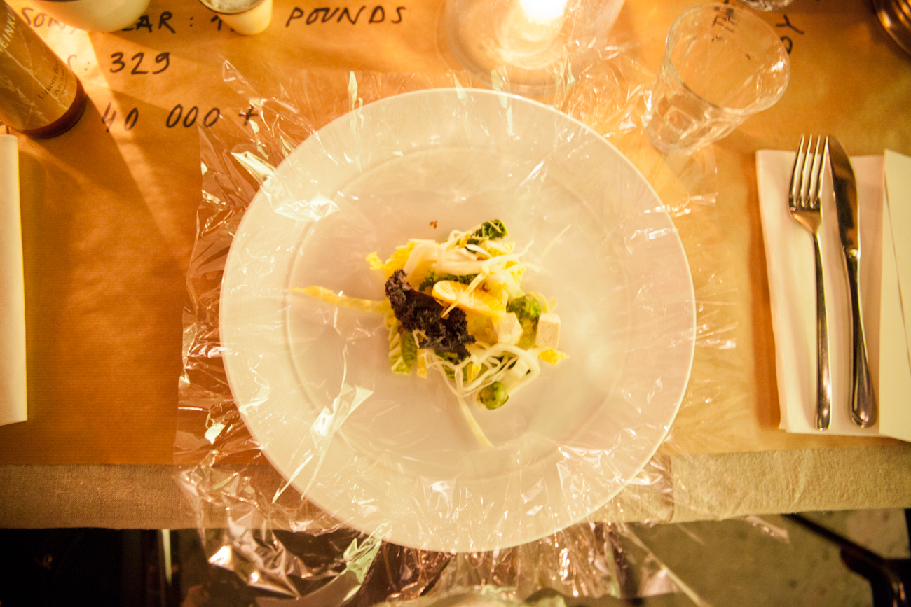 – I liked that young shrimp fisher. He was really charming, says the lady across from my seat. While people meet and greet, our first dish of the evening is being served. A mysterious-looking “surprise salad” wrapped in cellophane and served with chopsticks sticking out of the plastic. Unwrapping the cellophane, it reveals black and green kale, roasted brusselsprouts (from Linda’s garden), pickled savoy cabbage, tangerines, tofu and fragrant szehuan pepper. The industrial atomizer bottles, with the tangerine vinaigrette, are used by the guests to spray over their own salad. We are a bit shy at first, but quickly get in to the groove. – Any spray bottles over there? A woman far to the left asks. All of a sudden bottles are traveling around the table.