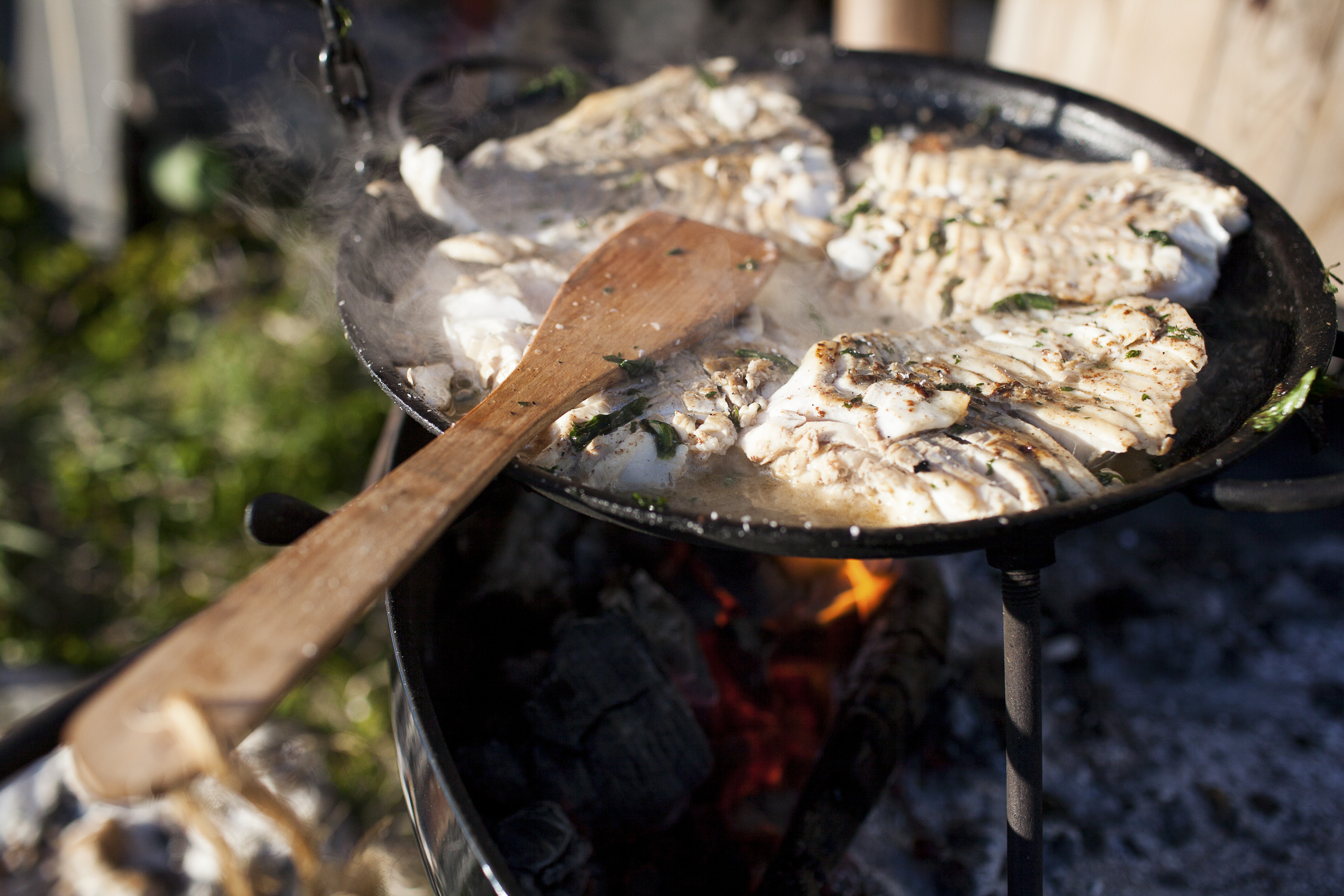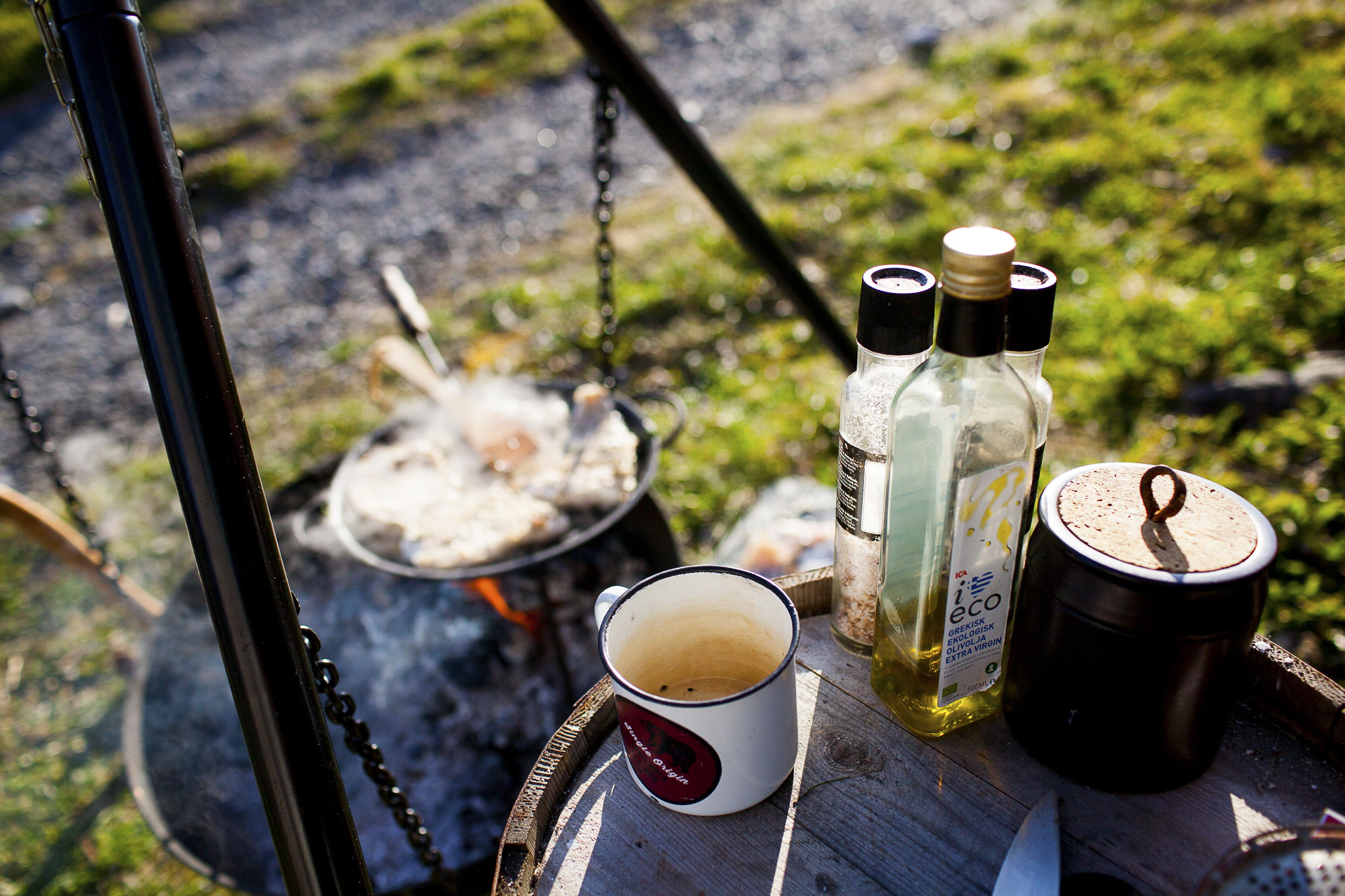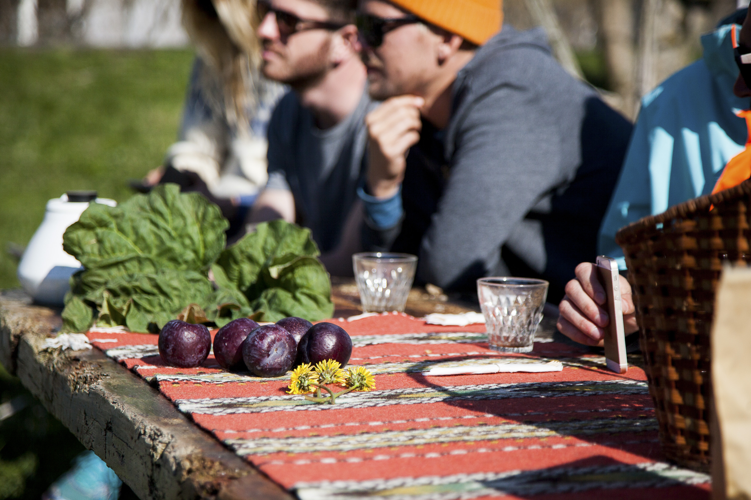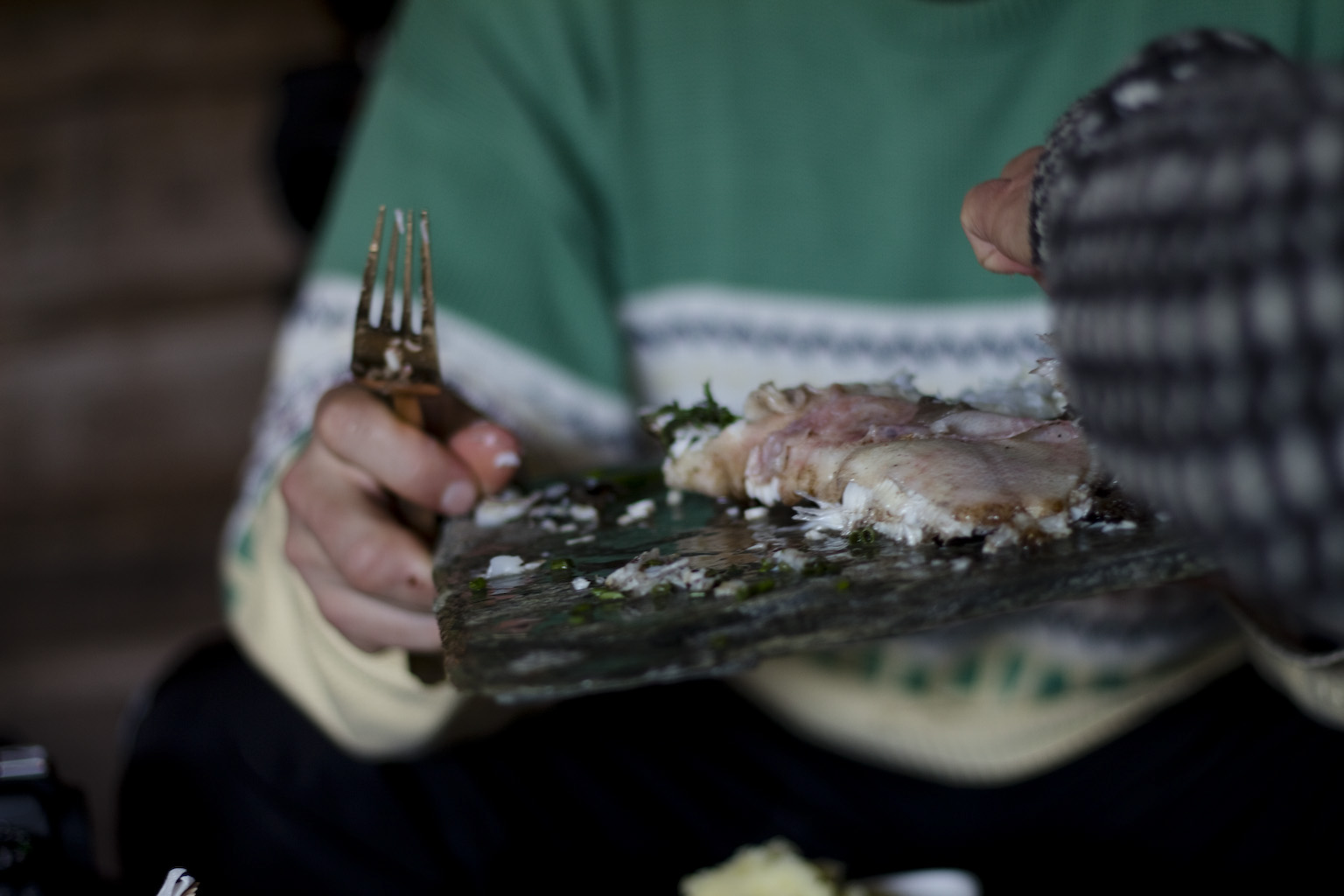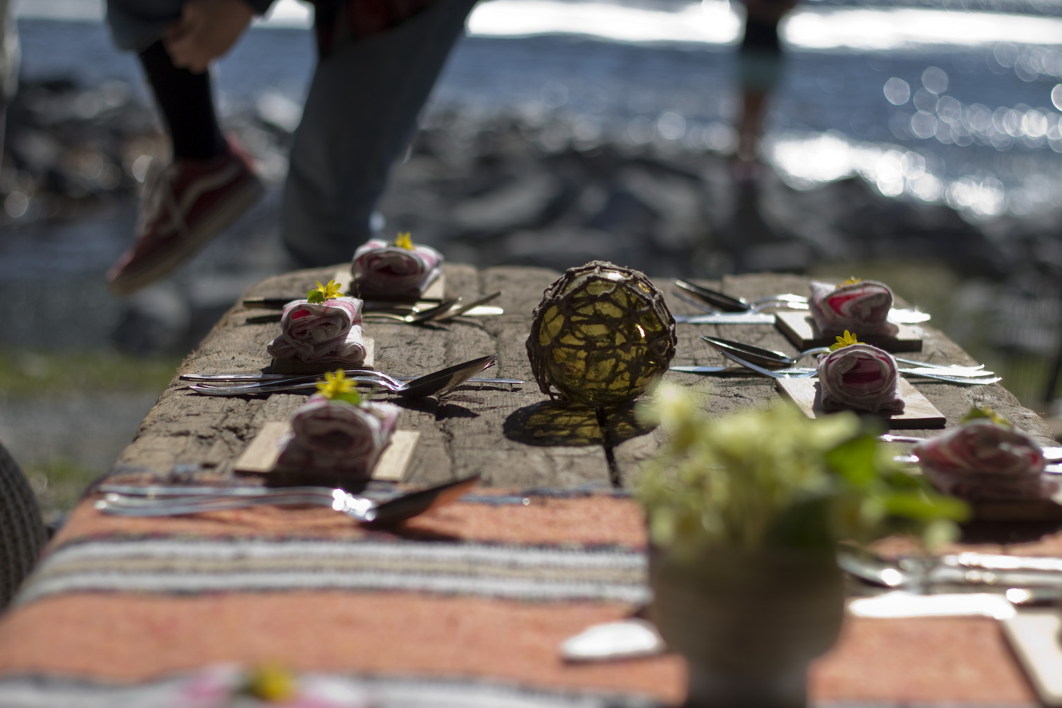Ending the circle of the local ecosystem, we walked over to Anne’s boathouse where a table was made by driftwood and old car tires. We used the local plants we had gathered in a salad, served together with roasted root vegetables, artichoke puree from Anne’s garden, and monkfish. The monkfish was caught the same day by Anne’s neighbour Jan Ove Hoddevik – a local farmer who happily becomes a fisherman when someone orders fish from him.