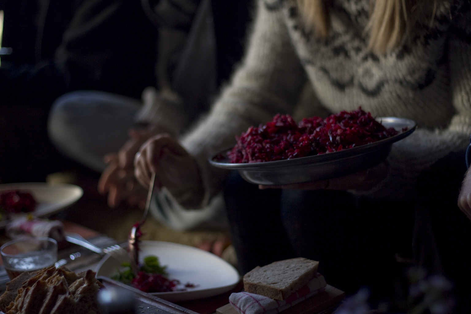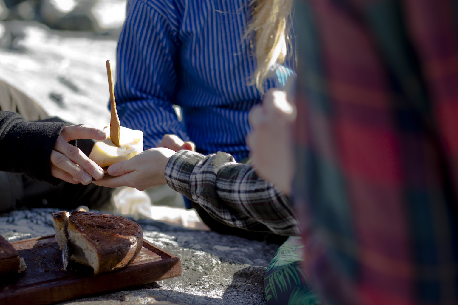 Although it takes 15 minutes to drive to the closest food shop in Hoddevika, we did not have to bring much to create a community table. Apart from the food we received and gathered locally in Hoddevika, a basic kit of apple cider vinegar, honey, salt, broth, Røros Smør (butter), and yesterdays’s bread from Åpent bakeri was all we needed. All the ingredients we brought with us are ingredients that are possible to obtain locally in Norway. Norwegian cuisine is traditionally largely based on the raw ingredients available in the wilderness, along the coast and in the mountains of the country: we used to make our own apple cider vinegar, we kept bees, we got salt by boiling sea water, cooked broth for the winter and made butter. It takes 7 litres of milk to make one kilo of butter, and butter thereby used to be a real luxury product back in the days.