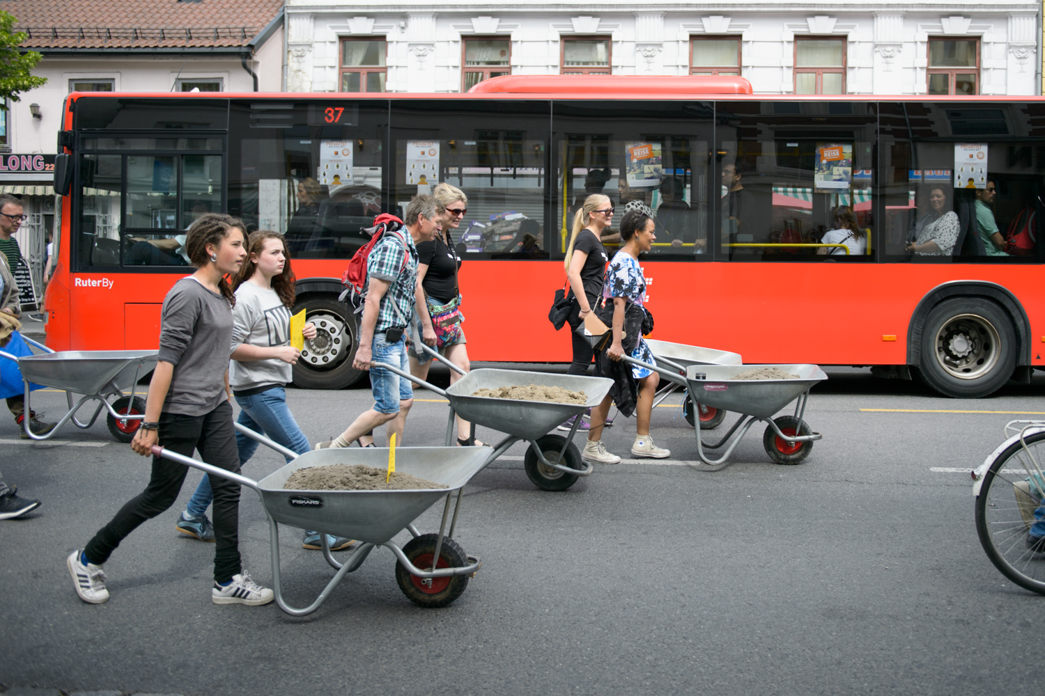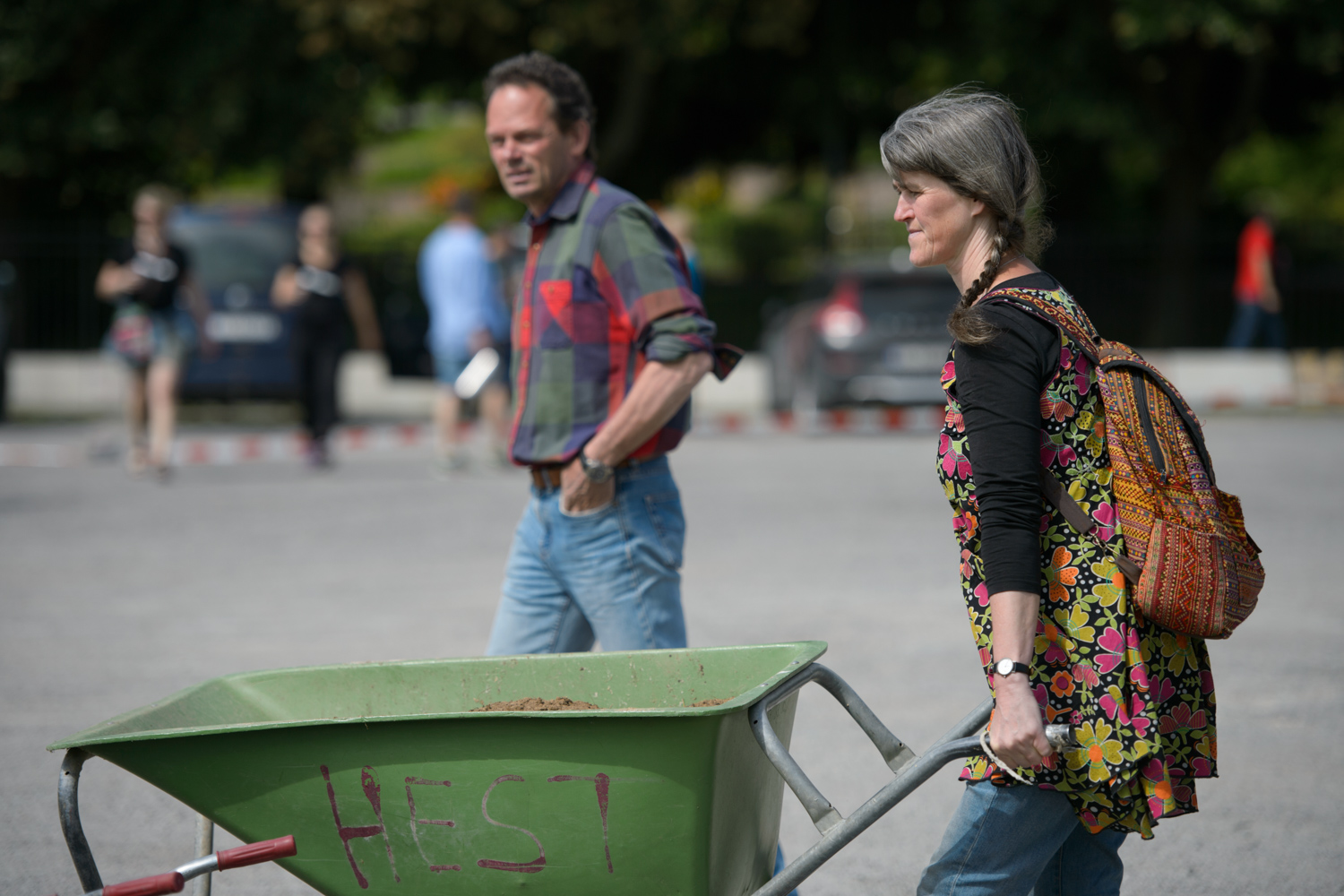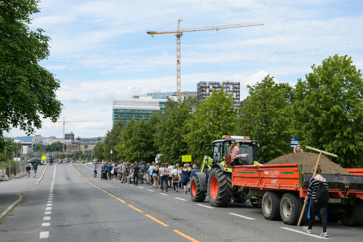 Walking behind a wheelbarrow through the urban, multicultural area of Grønland in Oslo feels slightly surreal. And surprisingly good. Drummers march right behind us, pushing the parade forward with their beats, waking up anyone who may try to take a nap this Saturday afternoon. Farmers from Tromsø in northern Norway to Stokke in south have brought soil in cars and trucks from their land into the city centre. In total around 50 wheelbarrows with soil from different farms. They brought a tractor too, and a horse walks in front. We are heading towards Losæter, a small piece of land amidst the waterfront development in Bjørvika.