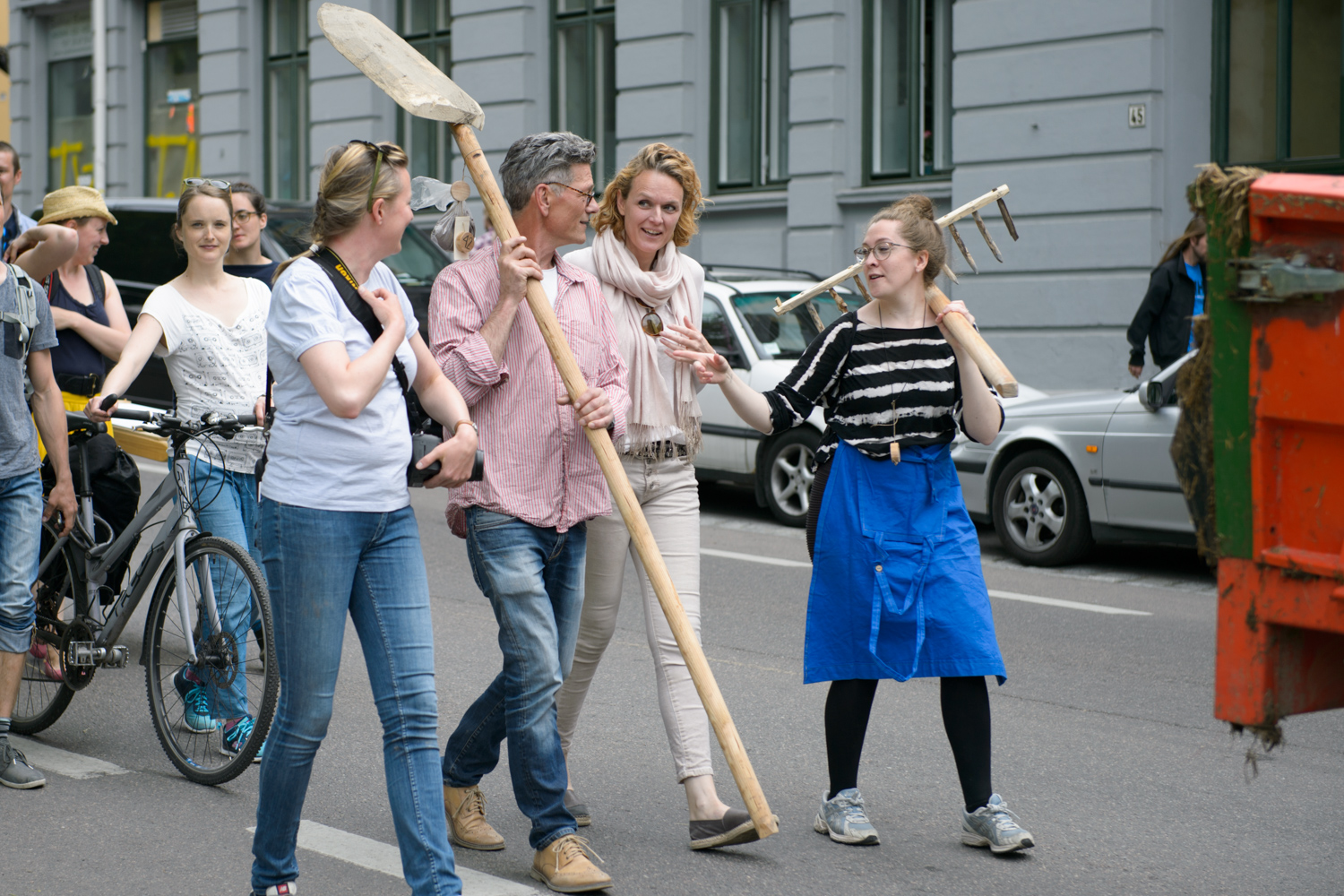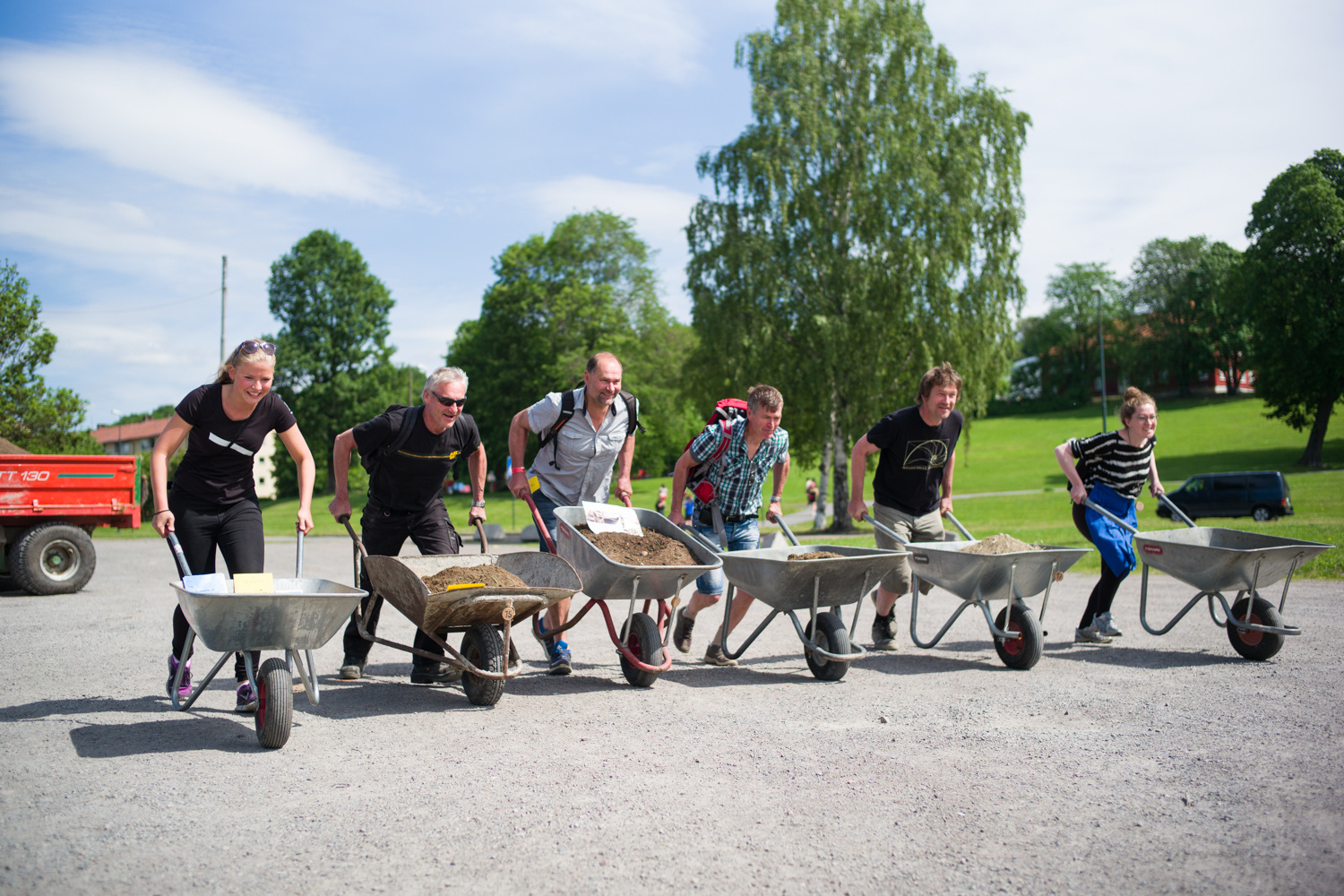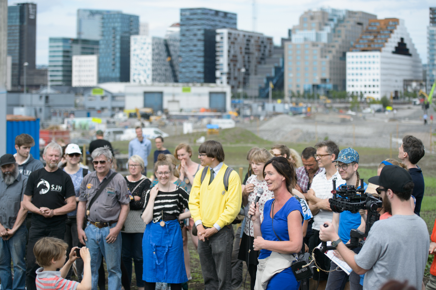 Walking behind a wheelbarrow through the urban, multicultural area of Grønland in Oslo feels slightly surreal. And surprisingly good. Drummers march right behind us, pushing the parade forward with their beats, waking up anyone who may try to take a nap this Saturday afternoon. Farmers from Tromsø in northern Norway to Stokke in south have brought soil in cars and trucks from their land into the city centre. In total around 50 wheelbarrows with soil from different farms. They brought a tractor too, and a horse walks in front. We are heading towards Losæter, a small piece of land amidst the waterfront development in Bjørvika.