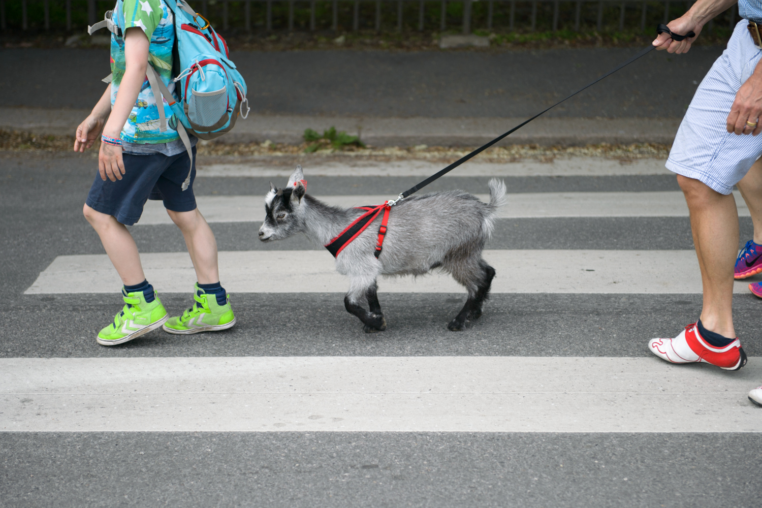 People along the road stop in their tracks, smiling faces in open windows, many are filming with their mobiles with the expression “what on earth is going on?” This may not be a common view for the inner city dwellers. Trotting along on the pavement, not overly impressed by this whole parade idea, a tiny, grey goat on a leash.