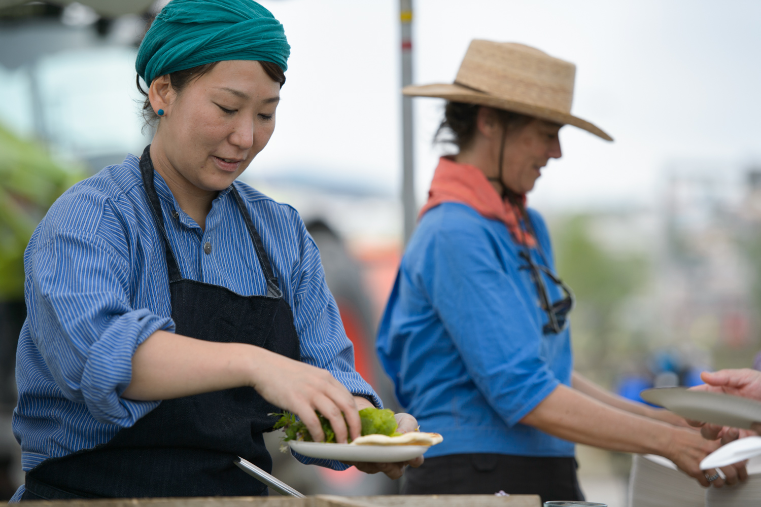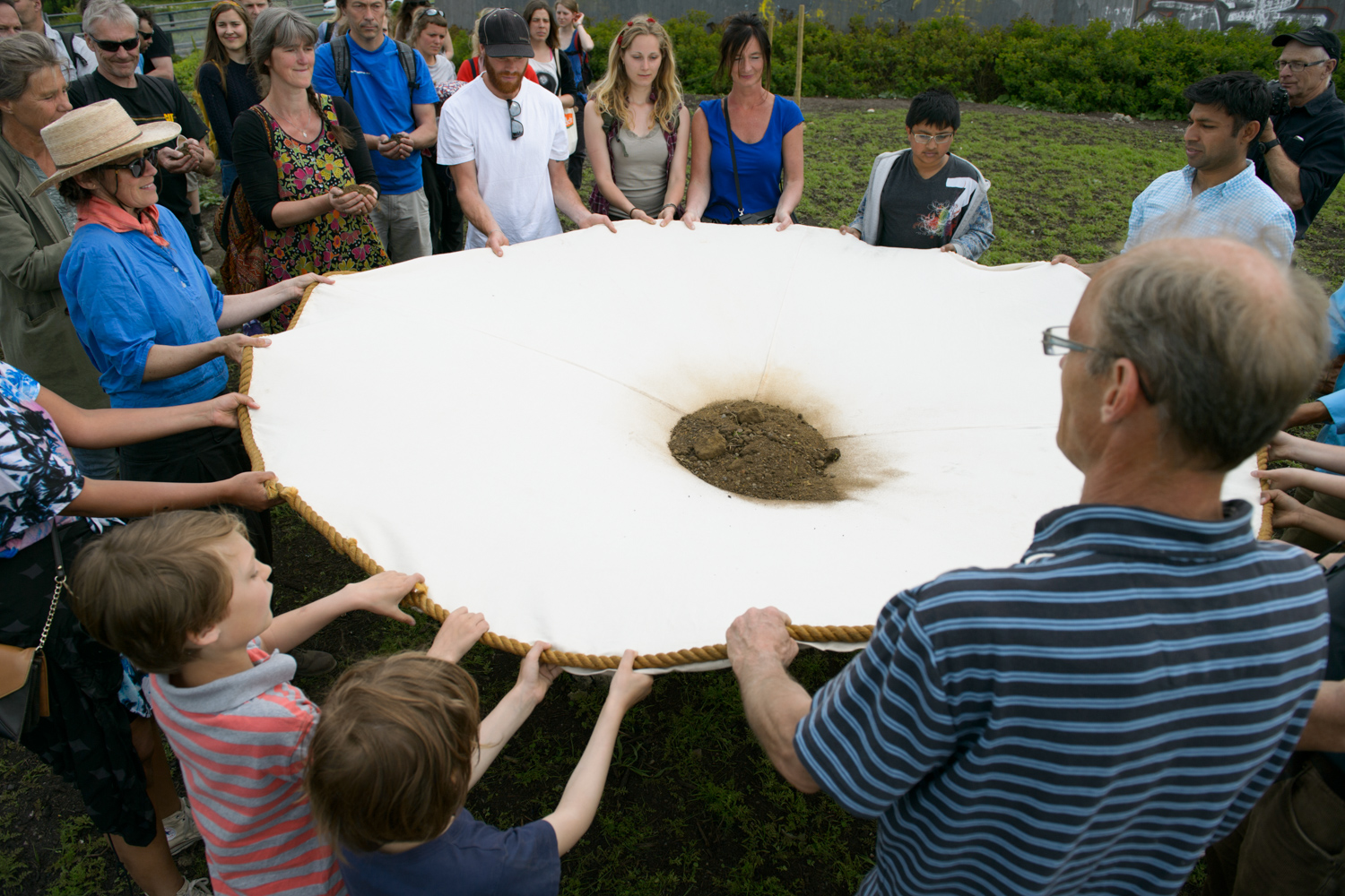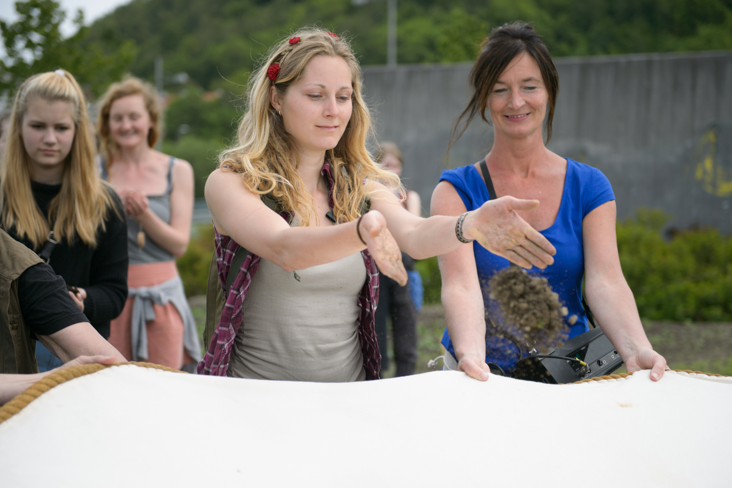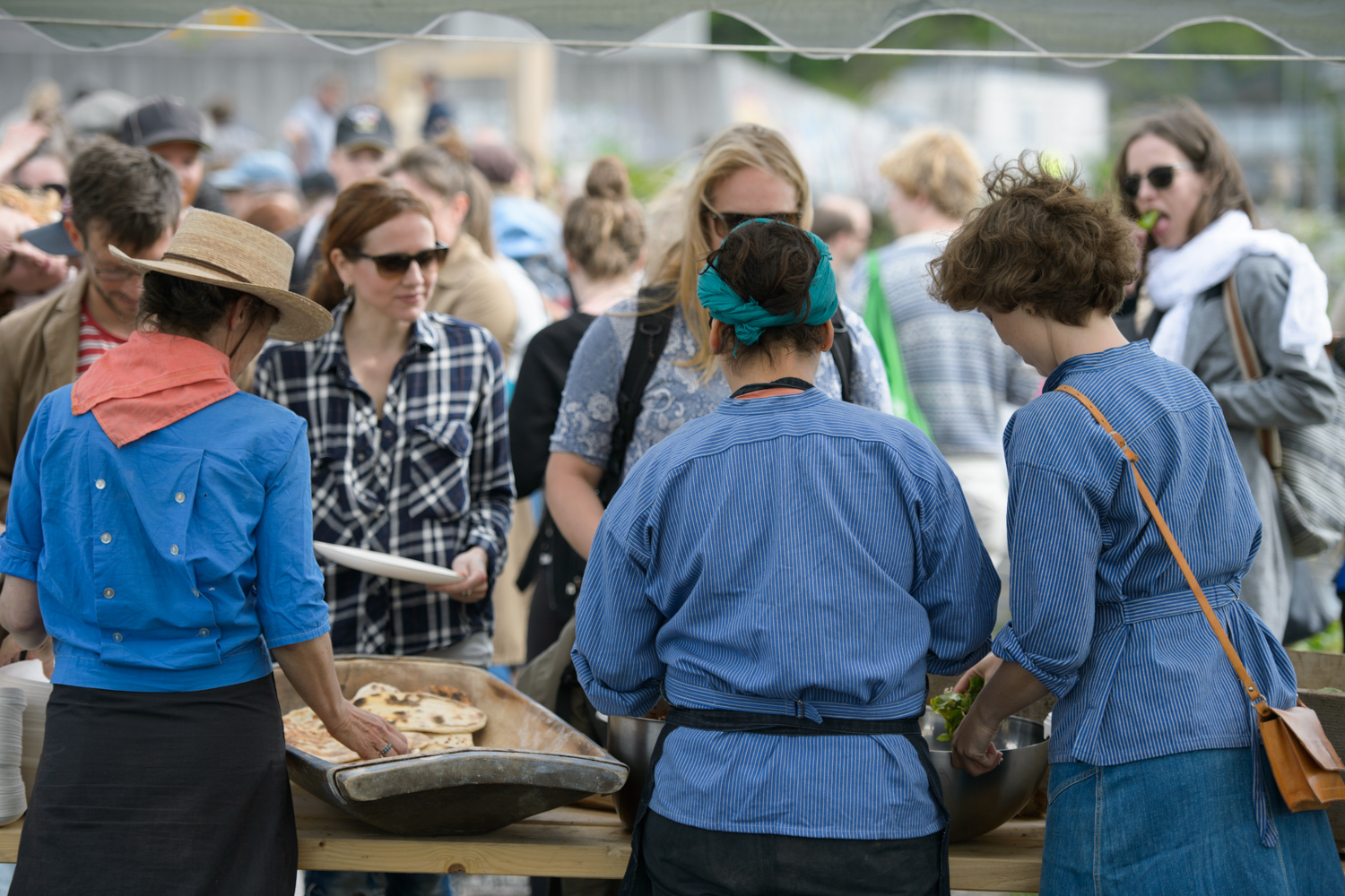 Upon arrival, the visiting farmers grab a handful of soil each and drop it on to a massive flatbread made of cloth. People are standing in a circle shaking the flatbread, mixing the lumps of soil together. Meanwhile, in the background, japanese chef Masayo Funakoshi and Food Studio are getting ready the first round of food for the crowd, a “Heggeli Farm” root vegetable pie with foraged pine shoot, nettle and seaweed from Zoe Christianses Fremtidens Mat. Washed down with freshly made, delicious raspberry juice.