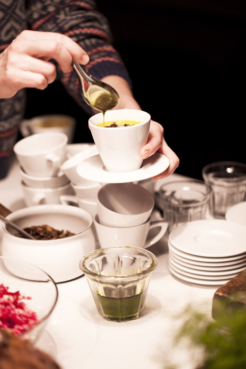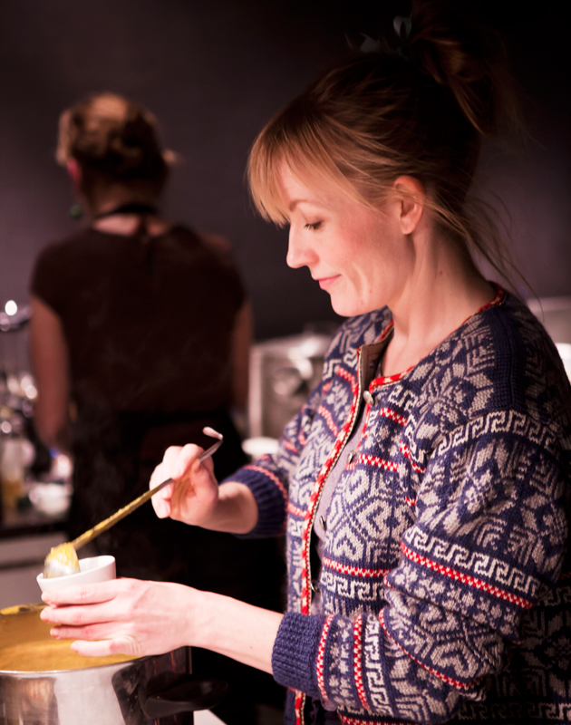 By the entrance wooly warm socks and Hokkaido soup awaits this evenings guests. Chairs lined up in front of the stage, chit chats by the soup, the chefs busy; preparing, tasting, adding, stirring. Inspiring lectures, listening, learning.