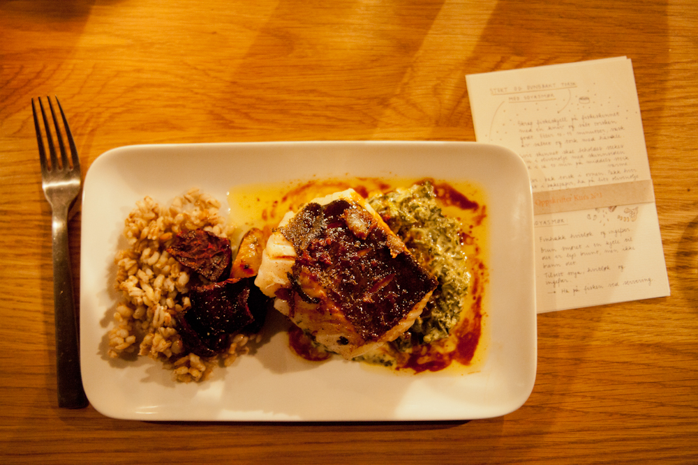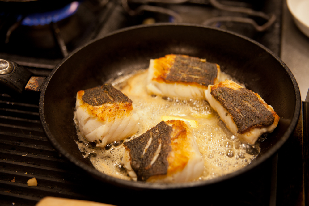 Keep the skin on and cut two slight cuts into it to keep it from curling in the pan. Ground some sea salt and pepper over the fish and fry in oil, on high heat for about 4 minutes. Then add a bit of butter to the pan and turn the filets. Fry for another minute (depending on the thickness of the filet).