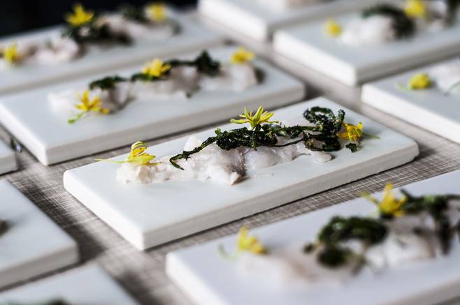 2. Sole Ceviche with Fried Dandelions and Edible Flowers