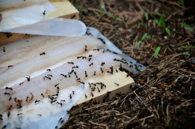 Start by freezing the fillets for at least 3 hours, and then defrosting in the fridge before use. This is to make sure there are no parasites in the flesh. Place the defrosted fillets on a clean wooden board. Stir around a little bit in the anthill with a wooden stick, before you place the wooden board with the fish carefully on top of it. Leave the fish on the anthill, and let the ants crawl all over the fish. The acid they secrete will now “cook” the fish, so that the flesh becomes whiter and firmer. This will take about 15 minutes, depending on the number of ants. Clean off the ants, and cut the fish into thin slices.